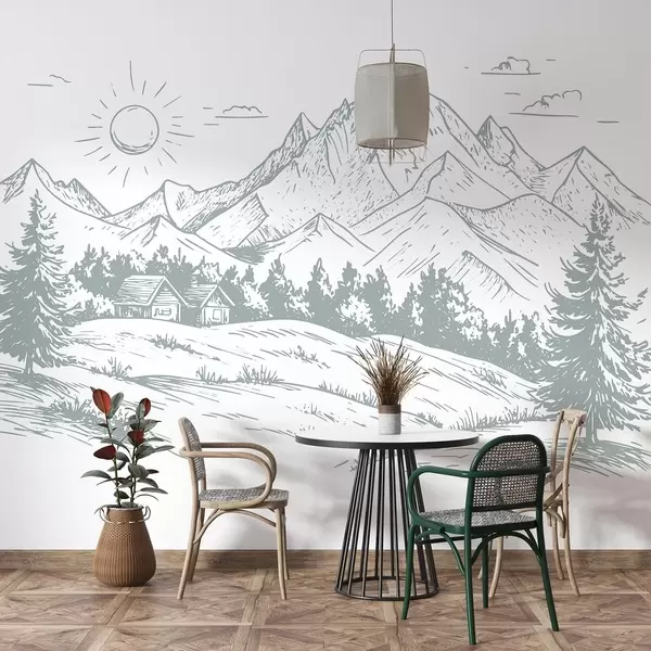 Fotomurales Dibujo de montañas, paisajes naturales, bosque, casas de madera, color menta Nr. w03347v1
