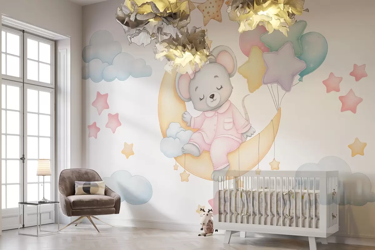 Fotomurales Adorable ilustración de un ratoncito dormido en la luna, rodeado de estrellas, nubes y globos Nr. w03380