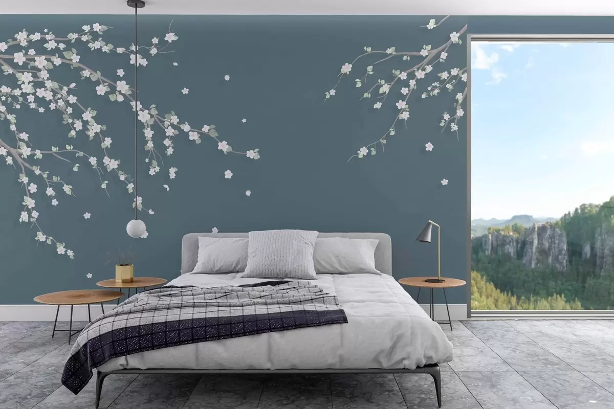 Fotomurales Rama floreciente en el fondo de una pared en estilo grunge azul Nr. w03393v1