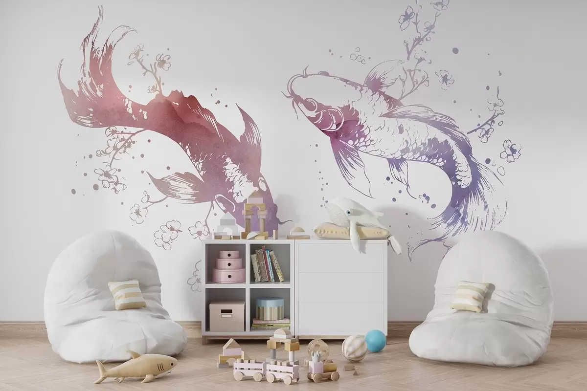 Fotomurales Acuarela pez, estilo oriental, cerezo, colores morados Nr. w03447v1
