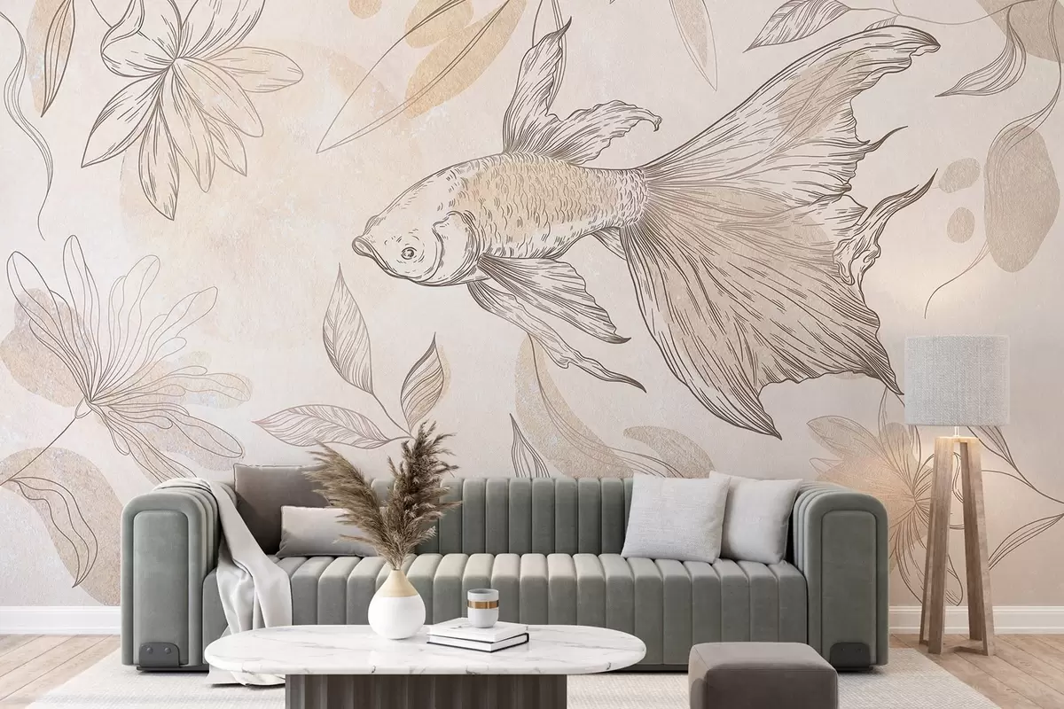Fotomurales Pez con elementos florales, fondo beige, dibujo lineal Nr. w03517