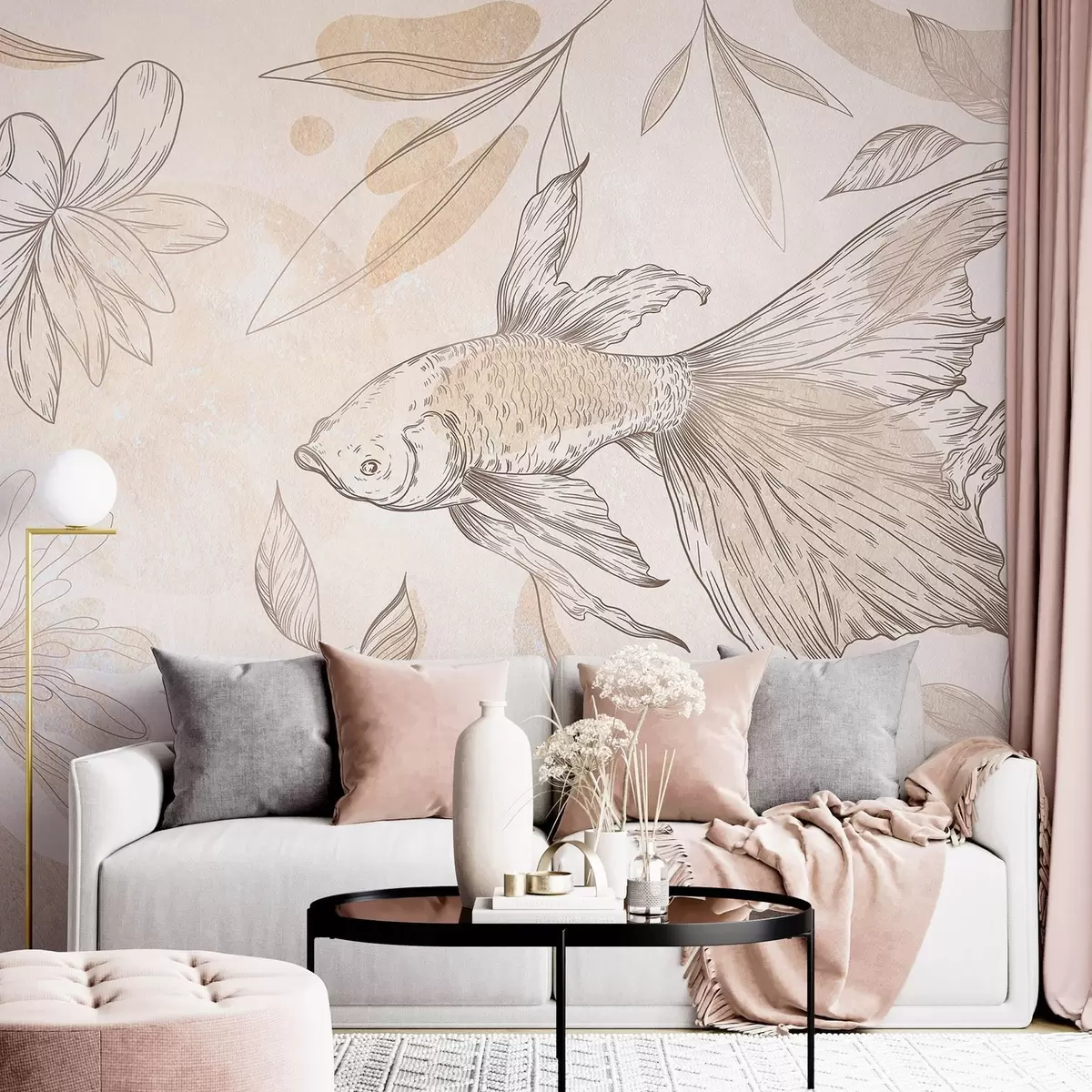 Fotomurales Pez con elementos florales, fondo beige, dibujo lineal Nr. w03517