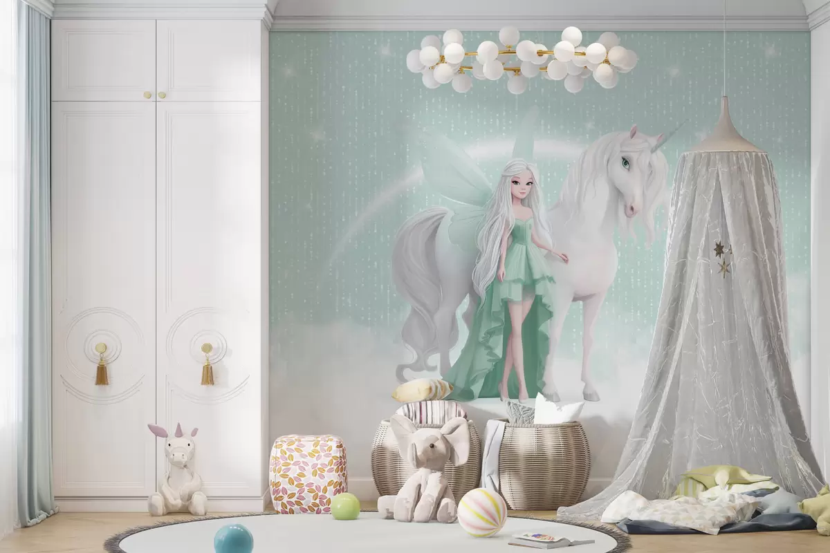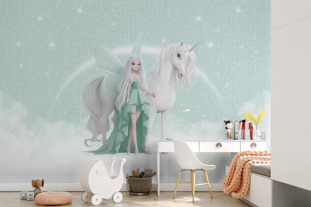 Fotomurales Un hada con un unicornio entre las nubes Nr. w03527v2
