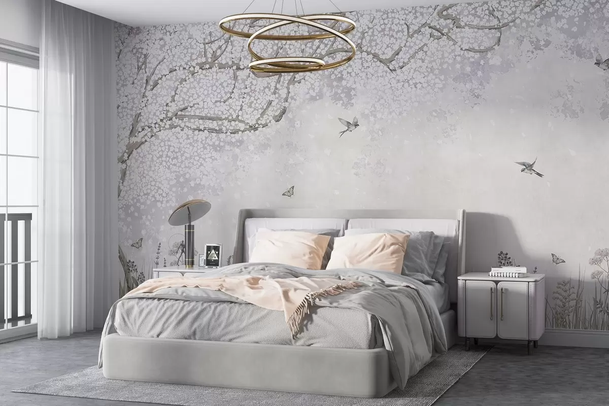 Fotomurales Árbol en flor con flores silvestres y pájaros Nr. w03700
