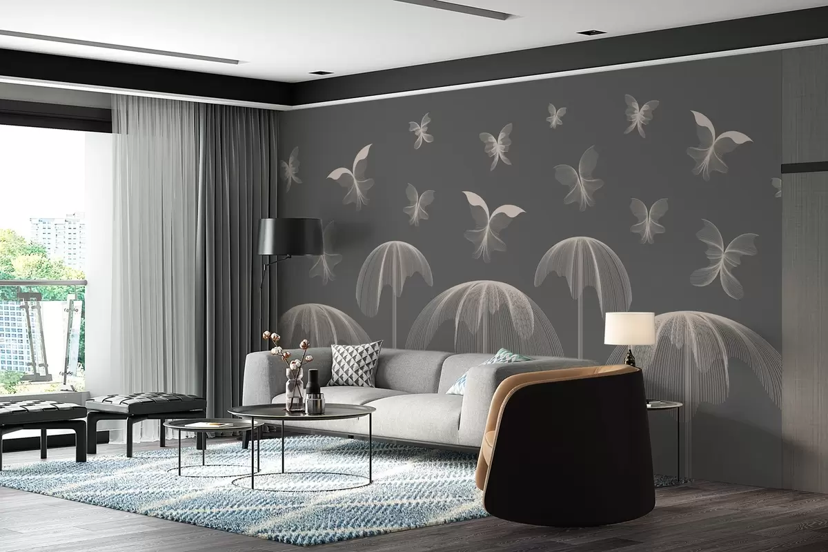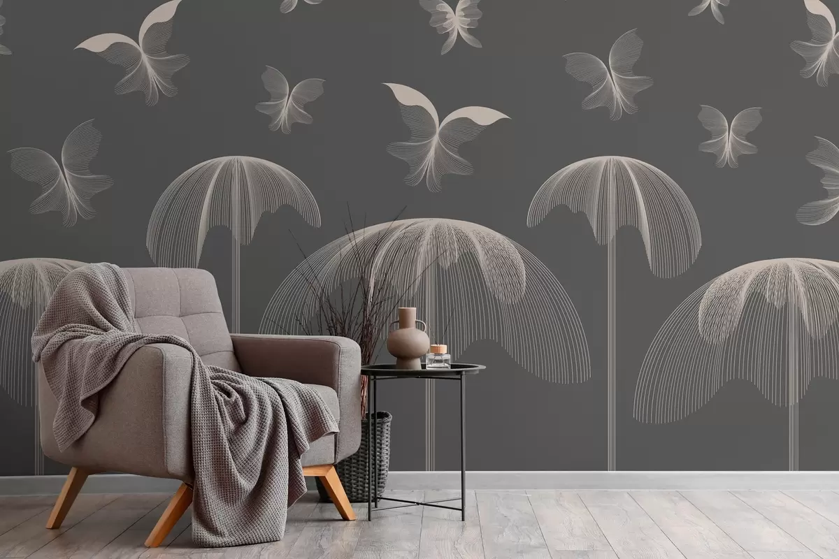 Fotomurales papel pintado minimalista lineal mariposas y fuentes sobre fondo gris oscuro Nr. w03762v1