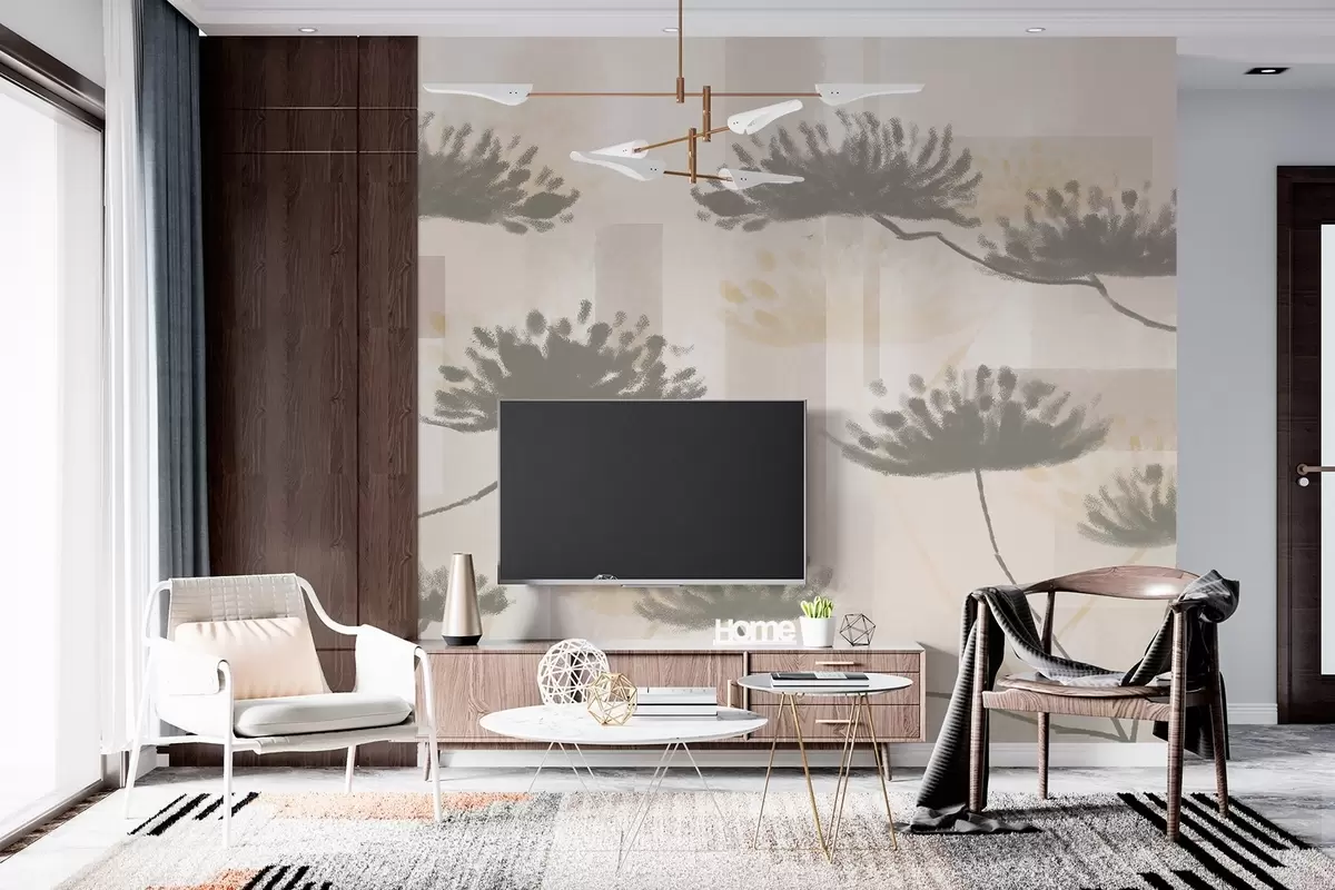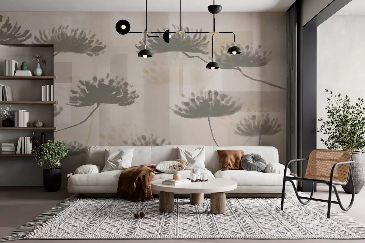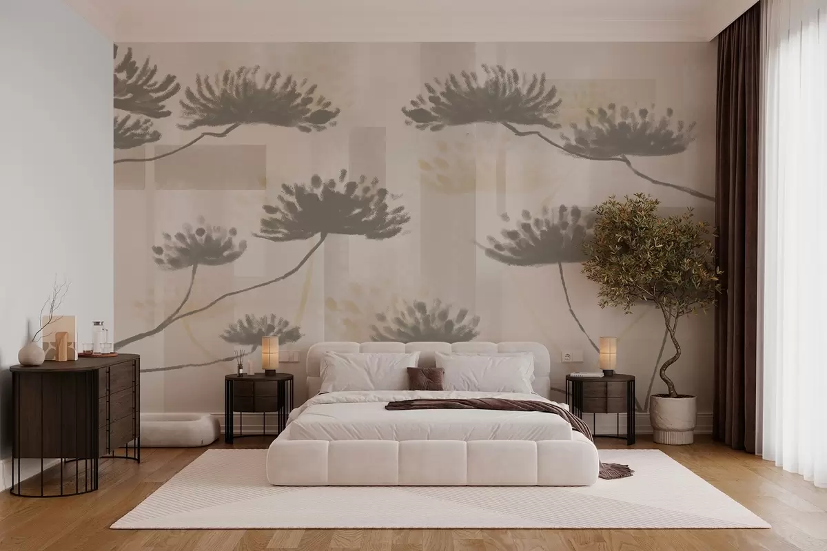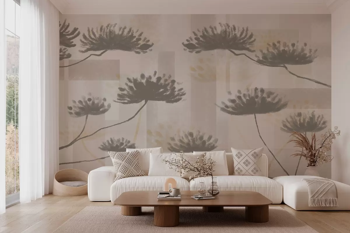 Fotomurales geometría texturizada en tonos beige y crema con estilizadas flores de paraguas Nr. w03960
