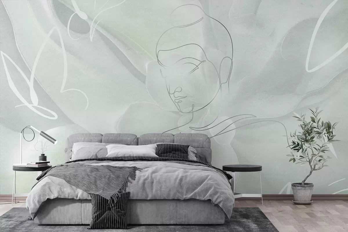 Fotomurales Abstracción floral con dibujo lineal de Buda, colores verdes Nr. w04004v3