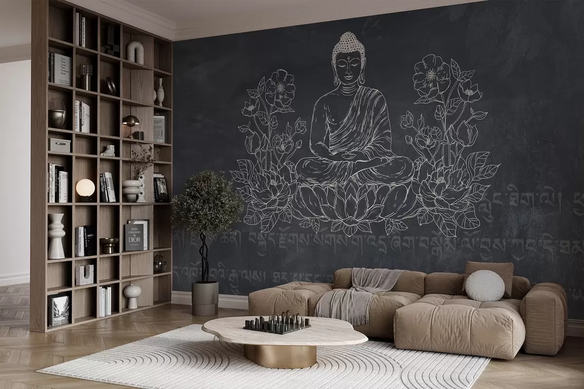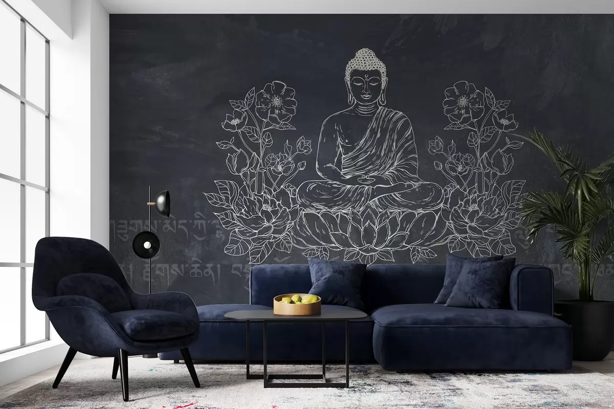 Fotomurales Buda meditando con flores de loto, arte lineal, oriental, fondo oscuro Nr. w04008