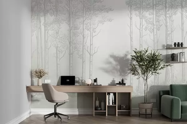 Fotomurales Bosque con abedules, minimalismo, naturaleza, paleta de colores verdes Nr. w04009v1