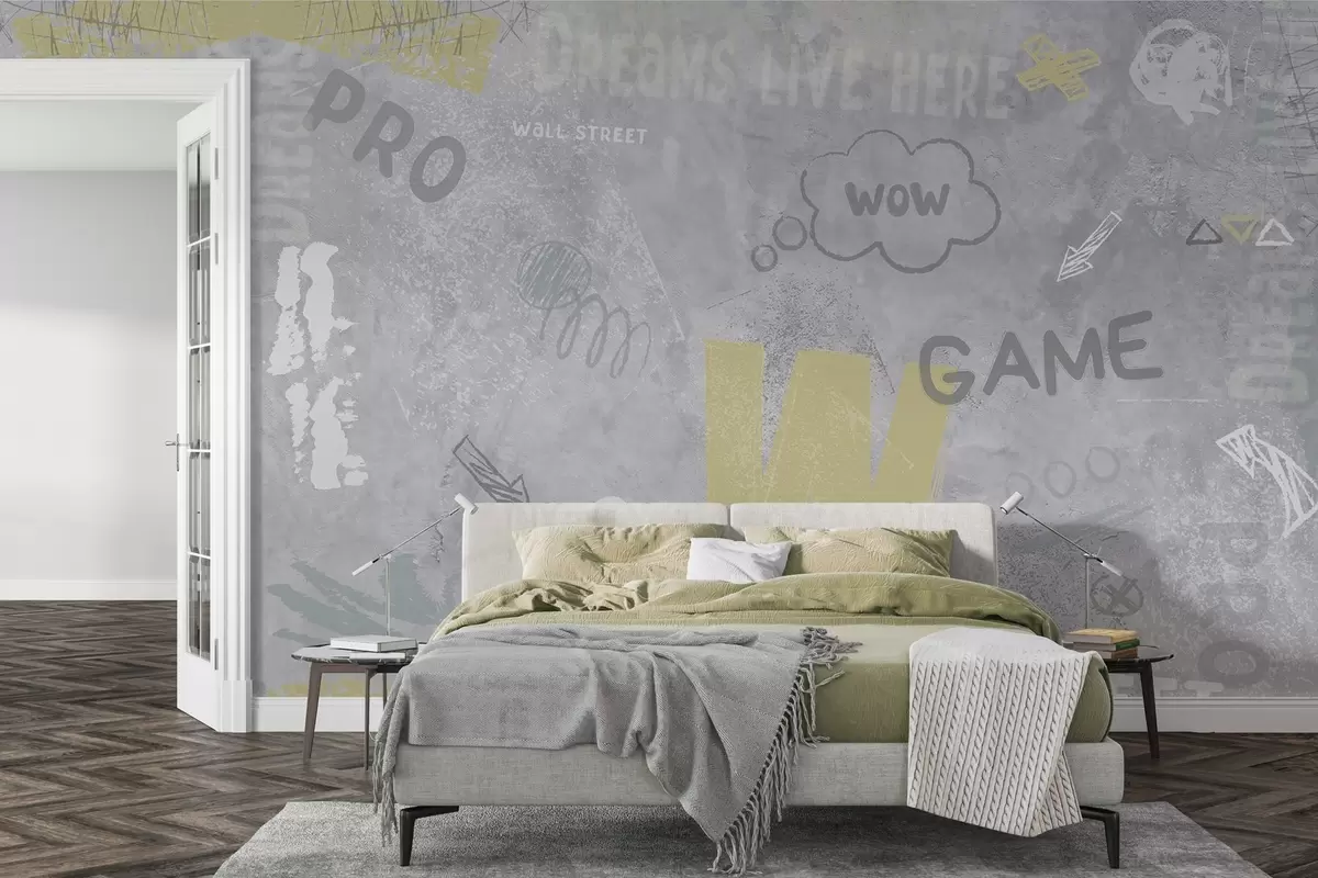 Fotomurales Diseño en estilo street art con inscripciones en color amarillo sobre fondo de muro de hormigón Nr. w04056