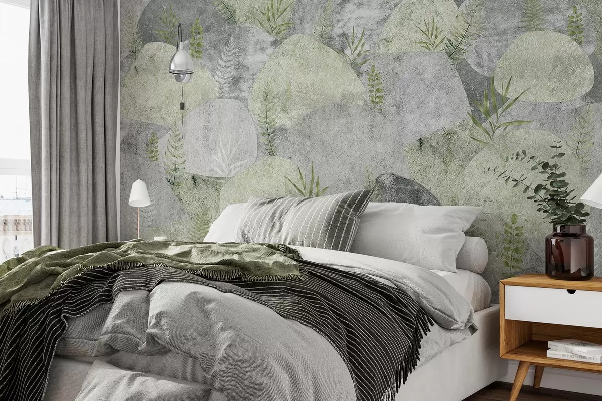 Fotomurales Piedras con plantas, helecho, nórdico, estilo rústico, colores gris y verde Nr. w04064v2