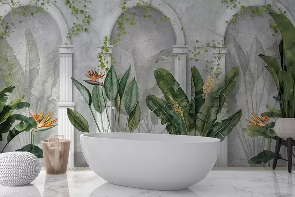 Fotomurales Muro de hormigón con arcos y plantas tropicales, florales, colores naturales Nr. w04065