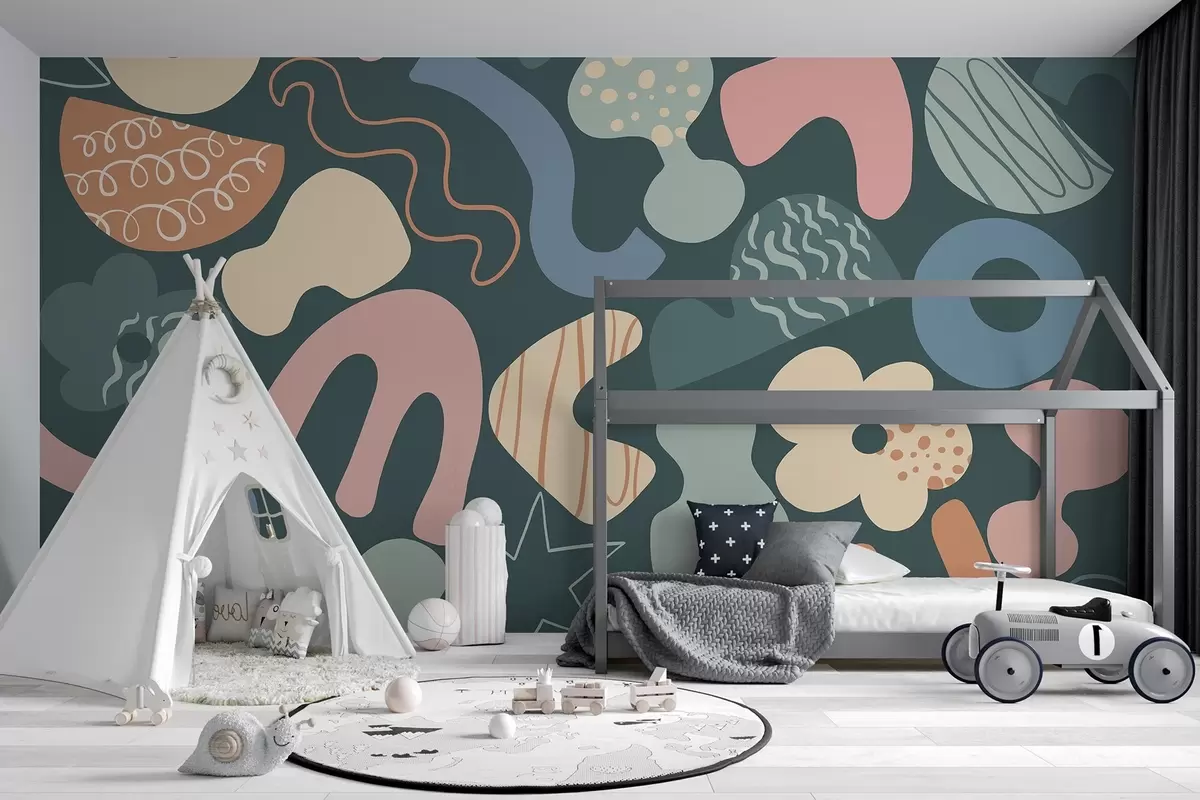 Fotomurales Figuras geométricas con garabatos dibujo, juvenil, fondo verde oscuro Nr. w04068v3