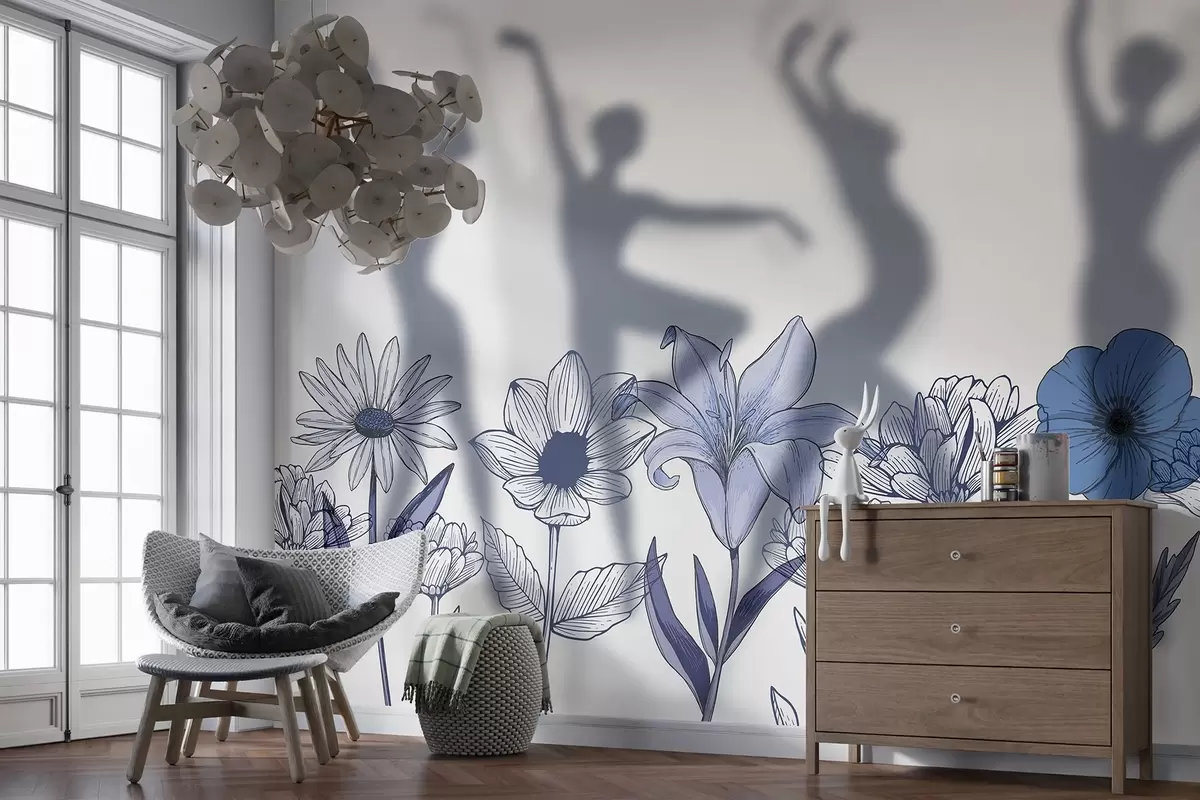 Fotomurales Siluetas de bailarinas, flores rústicas, arte lineal, colores azules Nr. w04069v3