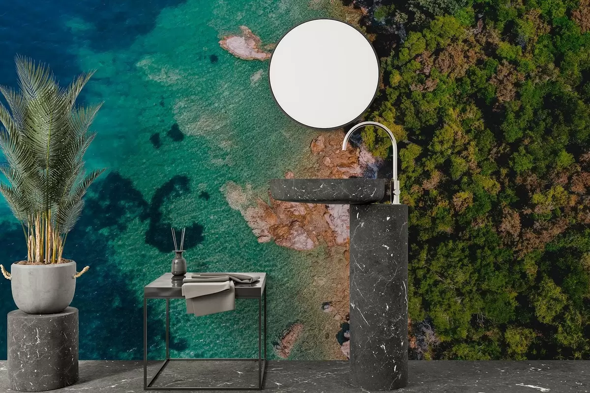 Fotomurales Costa de España con agua marina, bosque de pinos, fotografía aérea Nr. w04099
