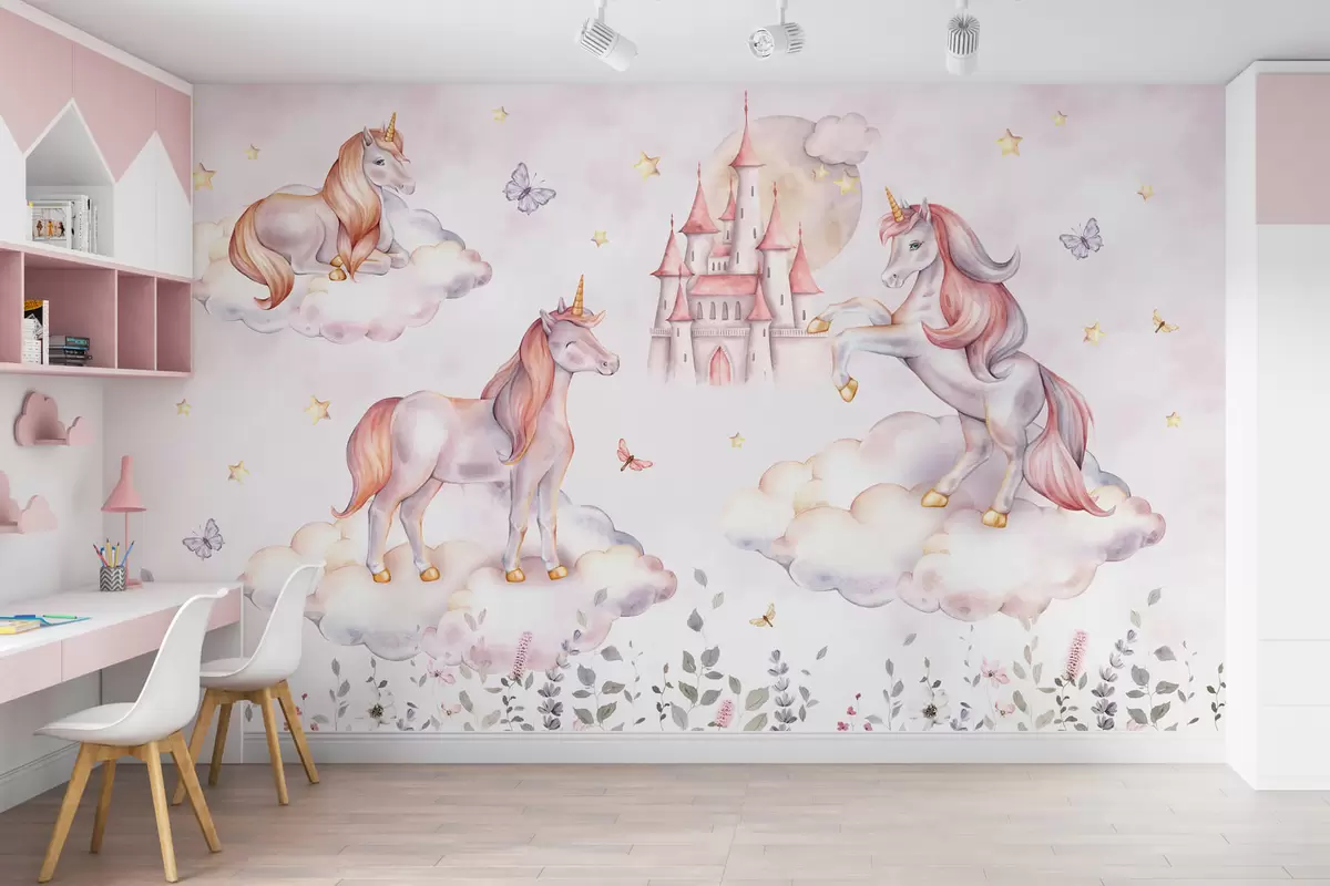 Fotomurales Unicornios en las nubes con estrellas, mariposas y flores Nr. w04165