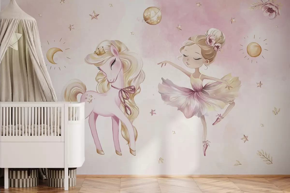 Fotomurales Unicornio y bailarina en un cuento de hadas rosa, cuento infantil Nr. w04196