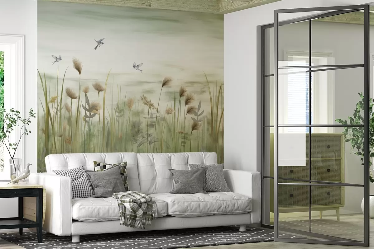Fotomurales Paisaje de hierba con golondrinas en un cielo suave Nr. w04258v1