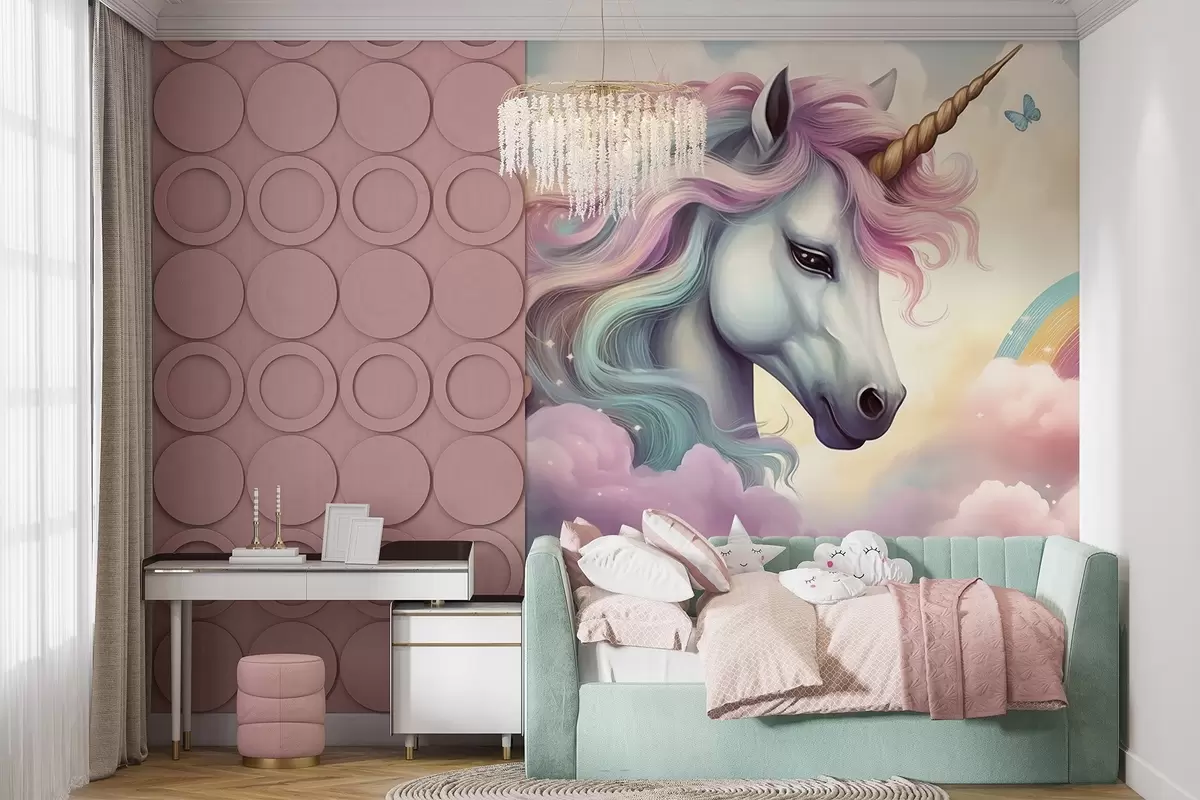 Fotomurales Unicornio en un cielo nublado con arco iris Nr. w04372