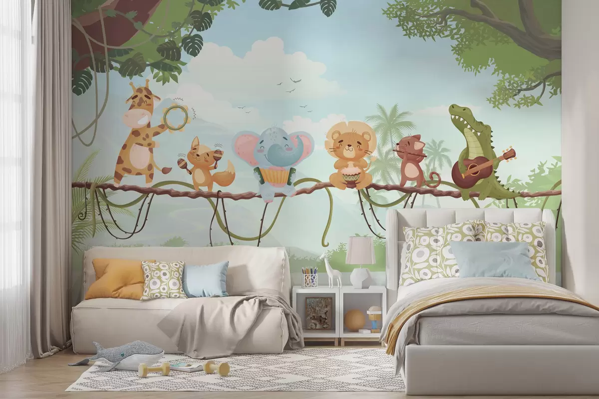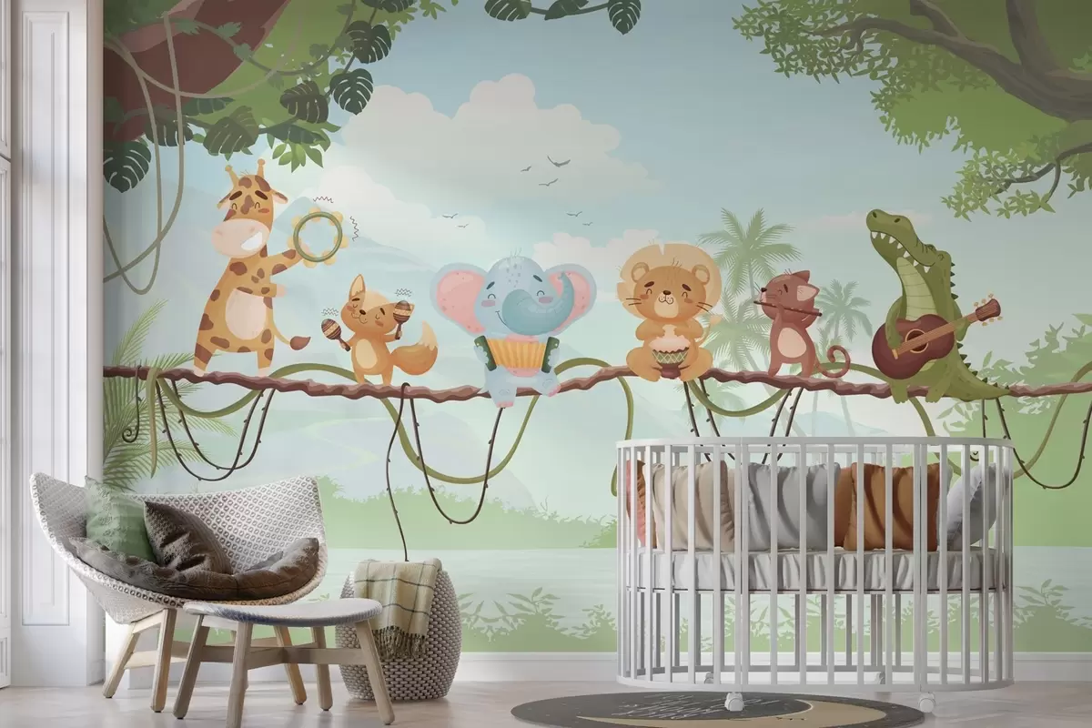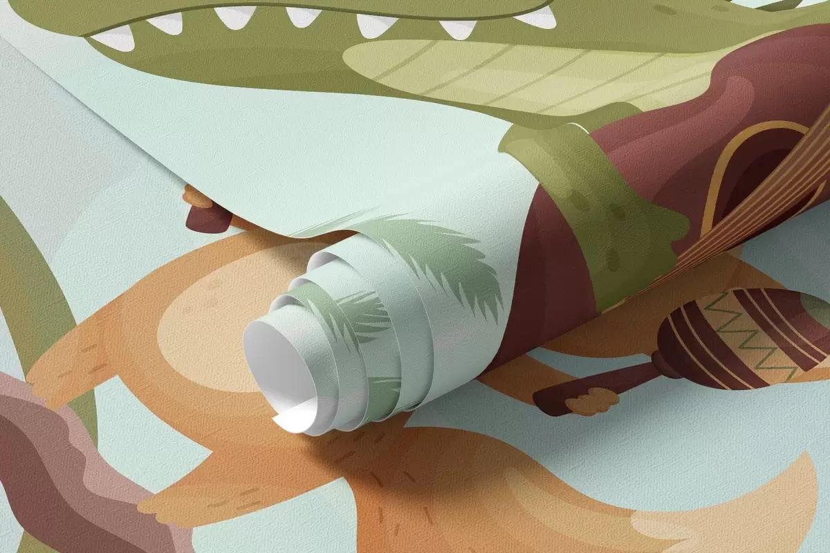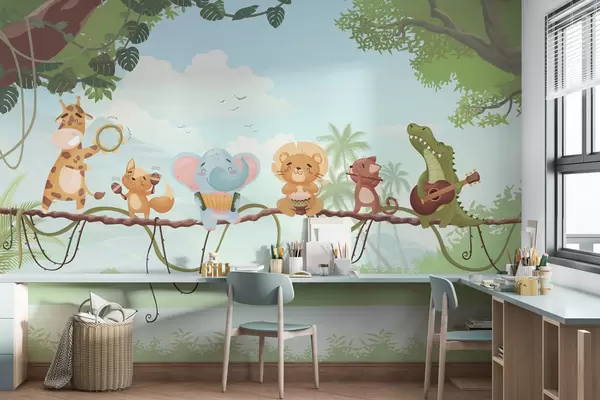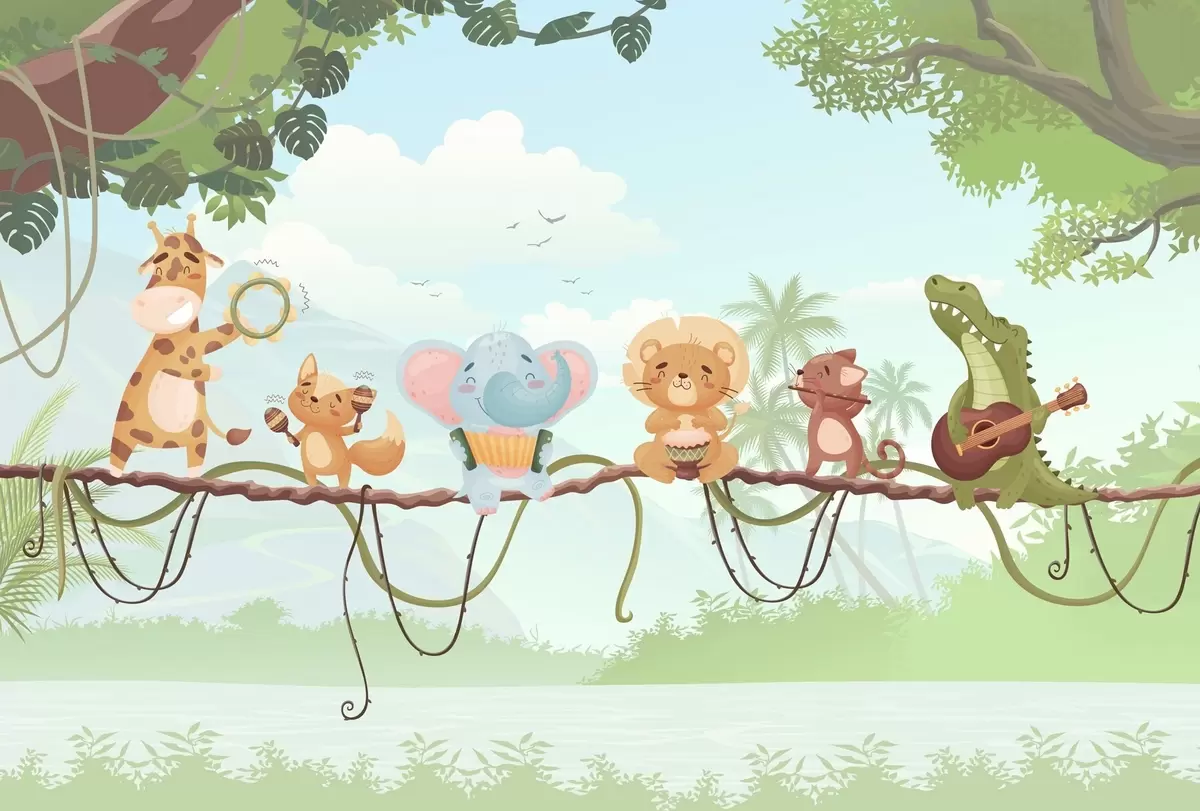 Fotomurales Animales con instrumentos musicales frente a un paisaje tropical. Nr. w04505