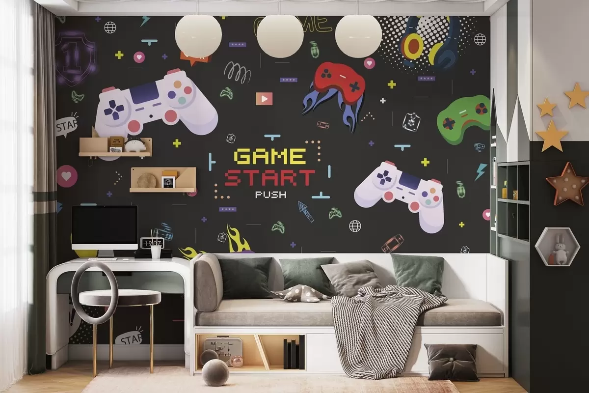 Fotomurales Diseño llamativo para gamers con consolas y texto pixelado Nr. w04581