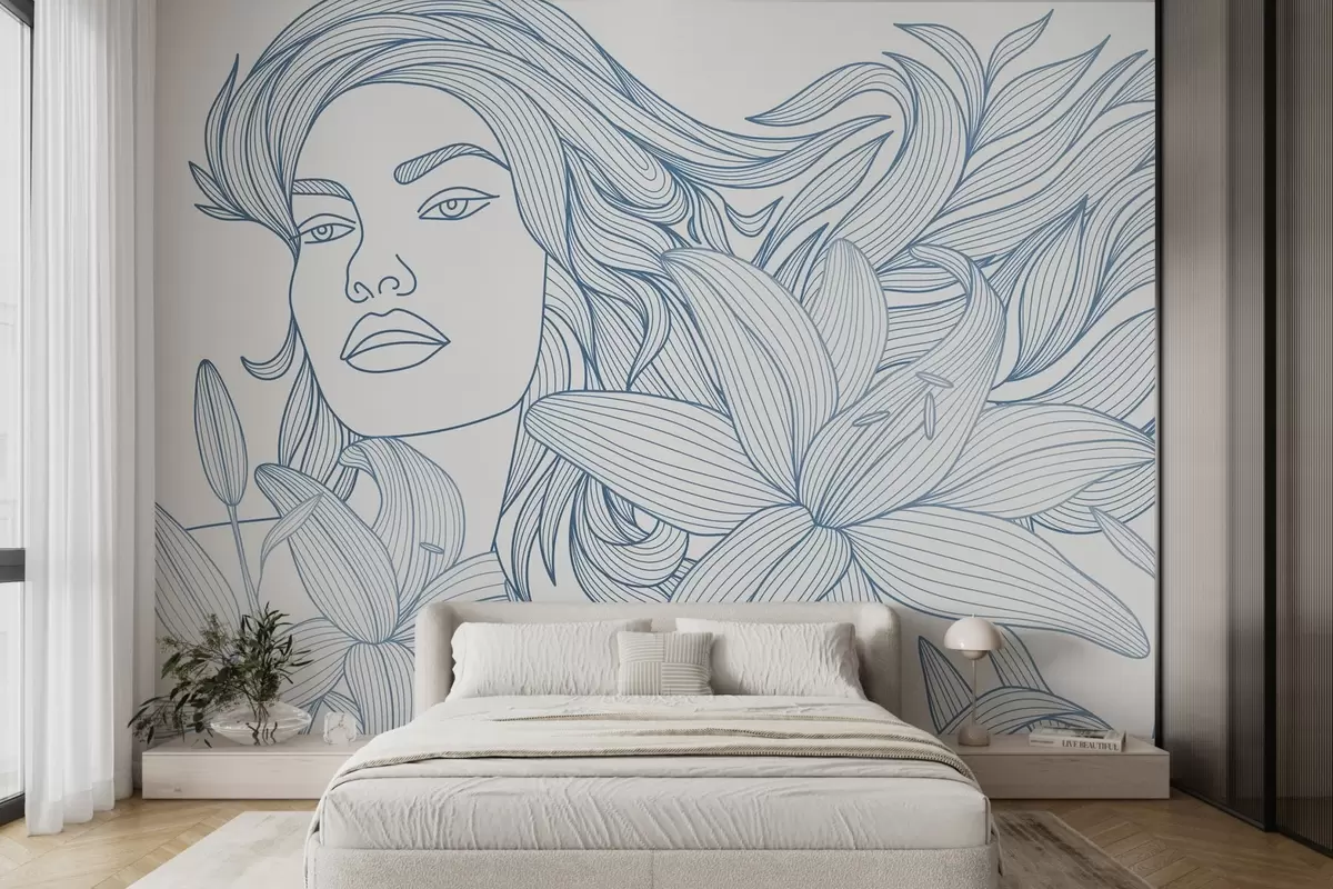 Fotomurales Retrato de una niña entre lirios en tonos azules Nr. w04689v2