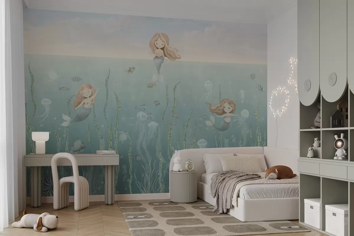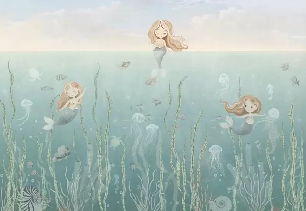 Fotomurales Sirenas juguetonas bajo el mar con algas, medusas y peces. Nr. w04860
