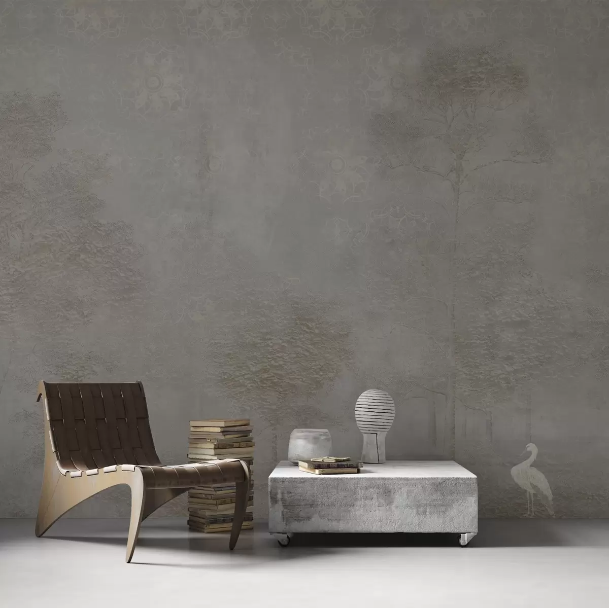 Fotomurales Bosque brumoso con una garza y un patrón ornamental encima. Nr. w04953v1