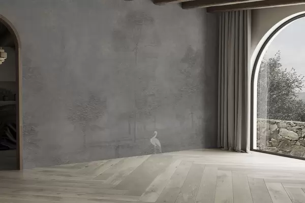 Fotomurales Bosque ligero y brumoso con una garza en tonos grises fríos. Nr. w04953v2