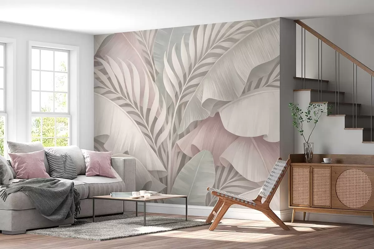 Fotomurales Grandes hojas tropicales en tonos frescos de rosa y gris. Nr. w05062v1