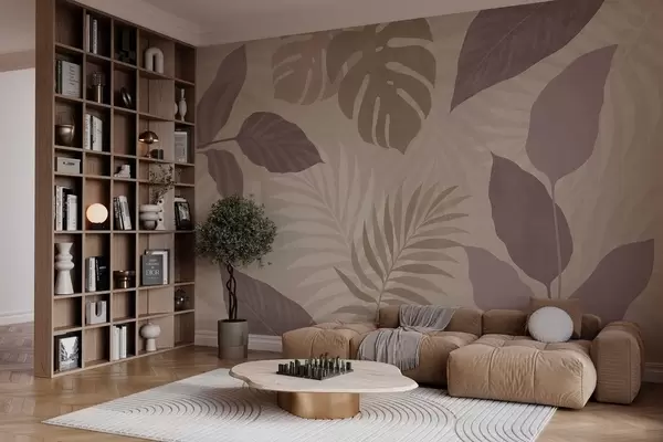 Fotomurales Hojas tropicales texturizadas sobre fondo arenoso. Nr. w05063