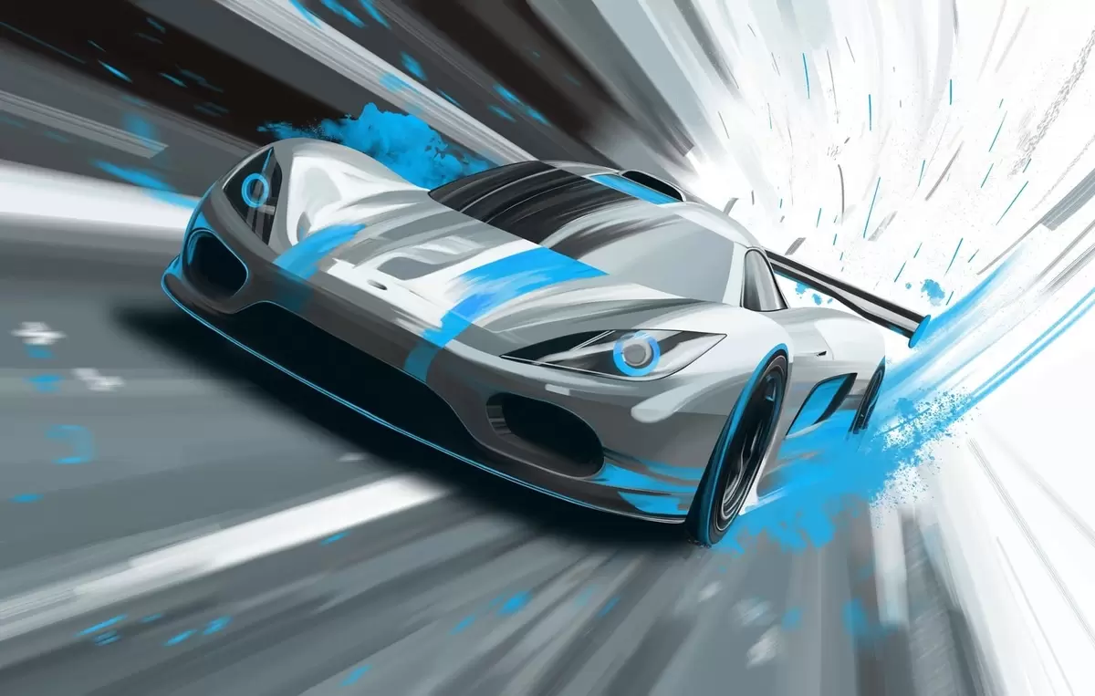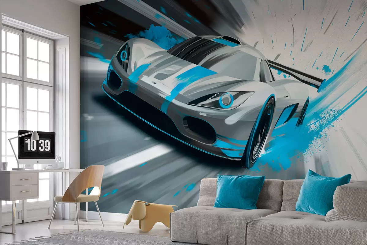 Fotomurales Coche deportivo dinámico con estilo de dibujo digital y detalles en turquesa. Nr. w05069v3