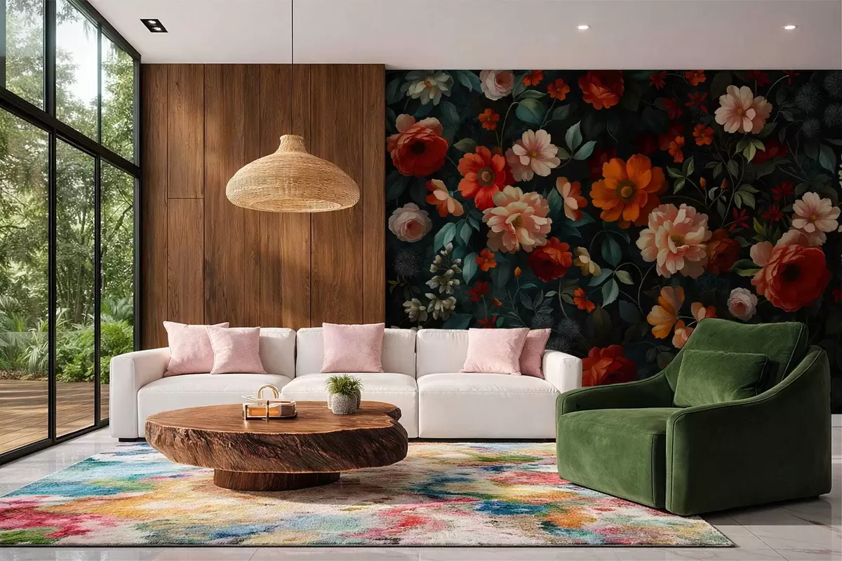 Fotomurales Estampado floral oscuro con exuberantes flores de jardín. Nr. w05087