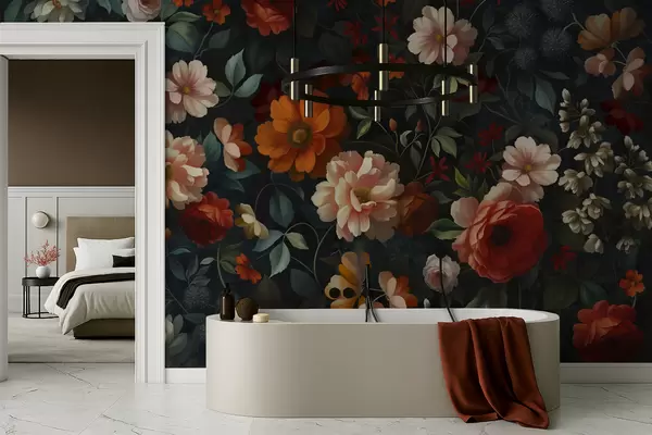 Fotomurales Estampado floral oscuro con exuberantes flores de jardín. Nr. w05087