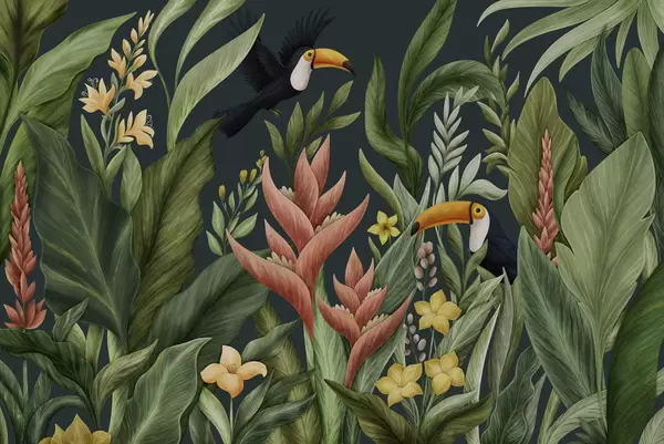 Fotomurales Plantas tropicales y aves de pico grande sobre fondo claro Nr. w05088