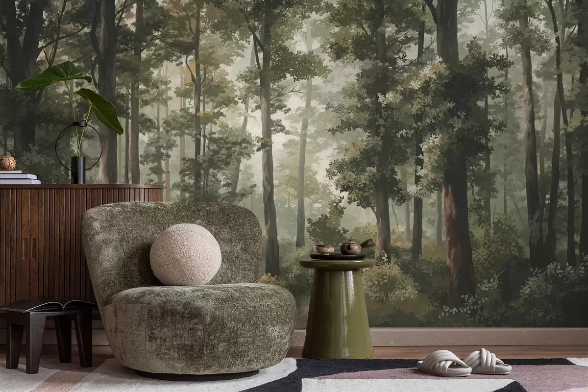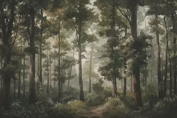Fotomurales Ilustración de un bosque con niebla, árboles altos y un sendero. Nr. w05089