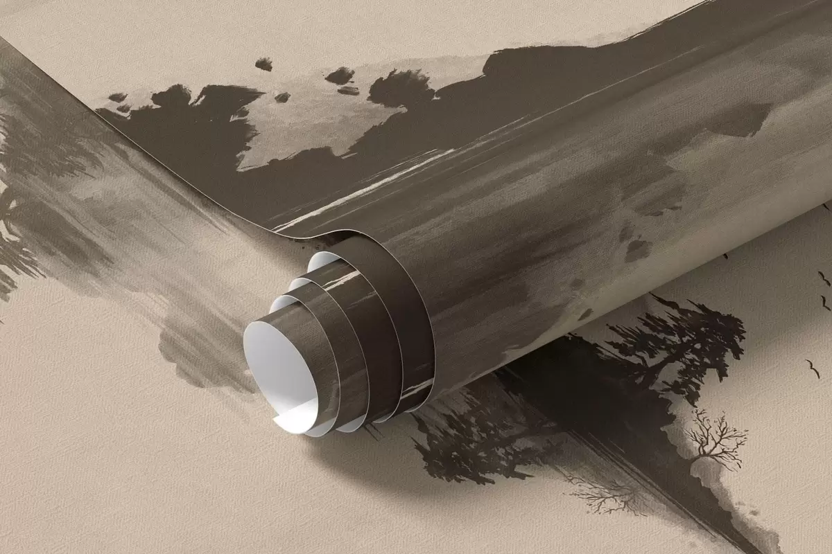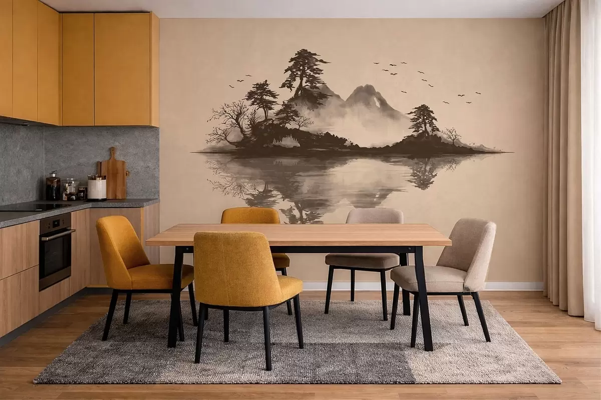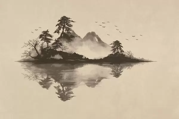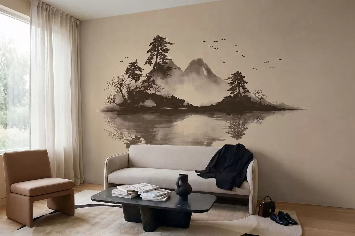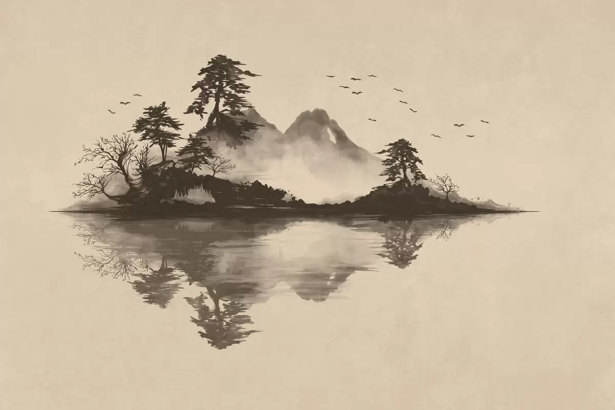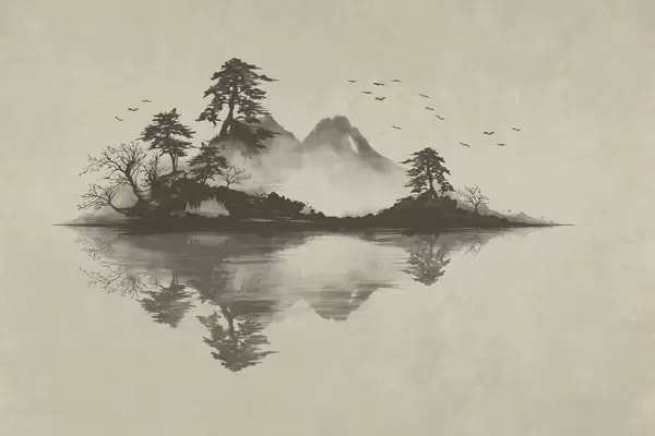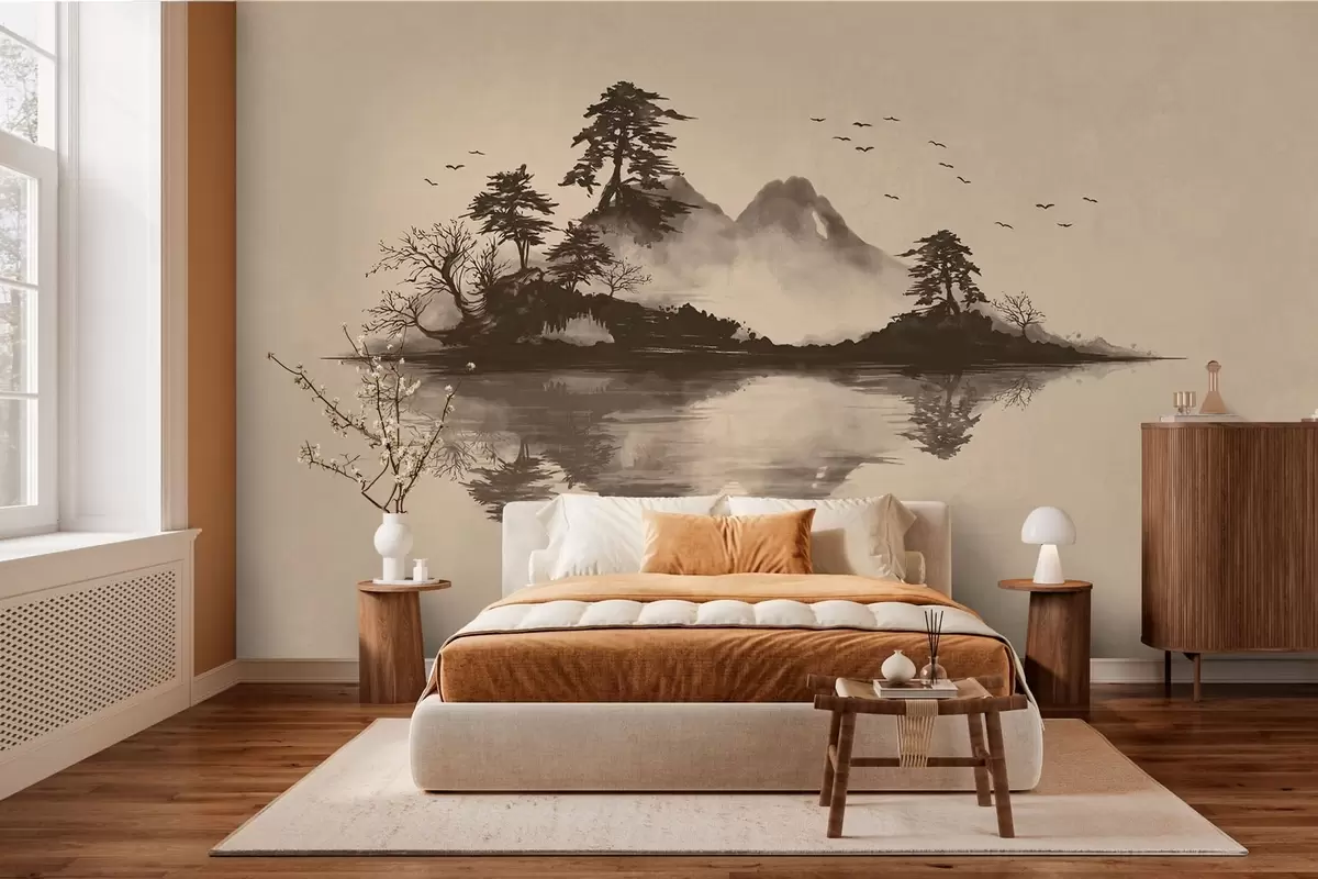 Fotomurales Paisaje montañoso en estilo sumi-e con pinos y reflejos Nr. w05124