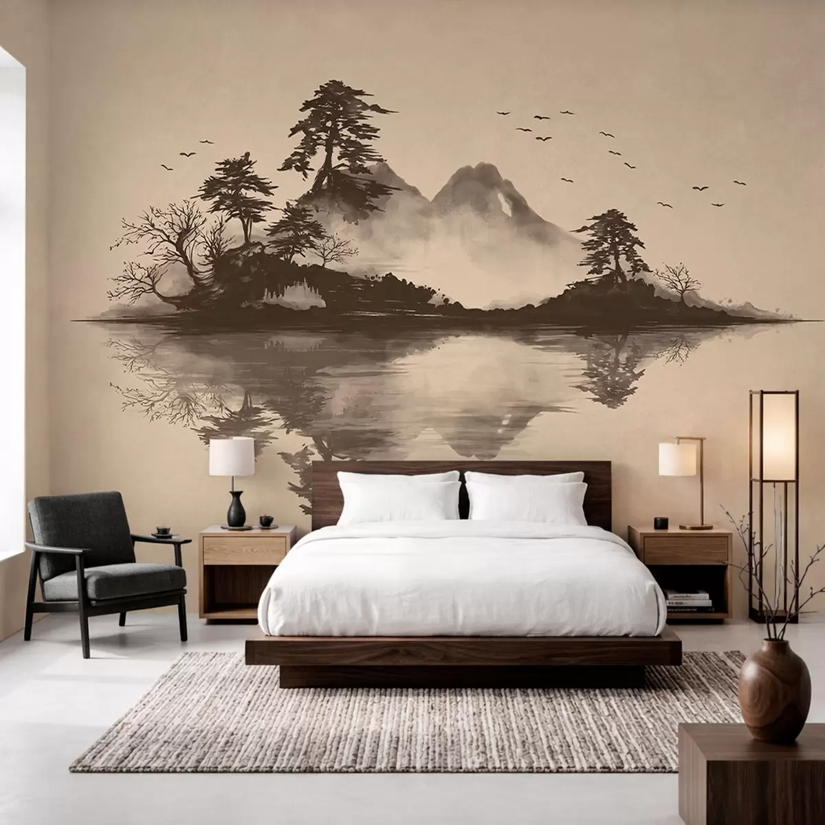 Fotomurales Paisaje montañoso en estilo sumi-e con pinos y reflejos Nr. w05124