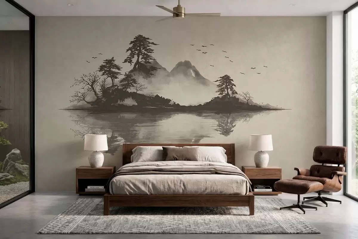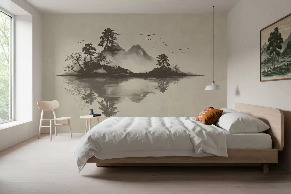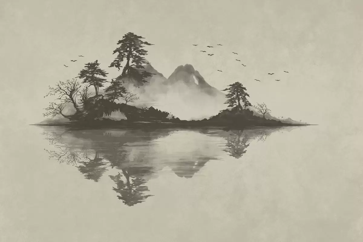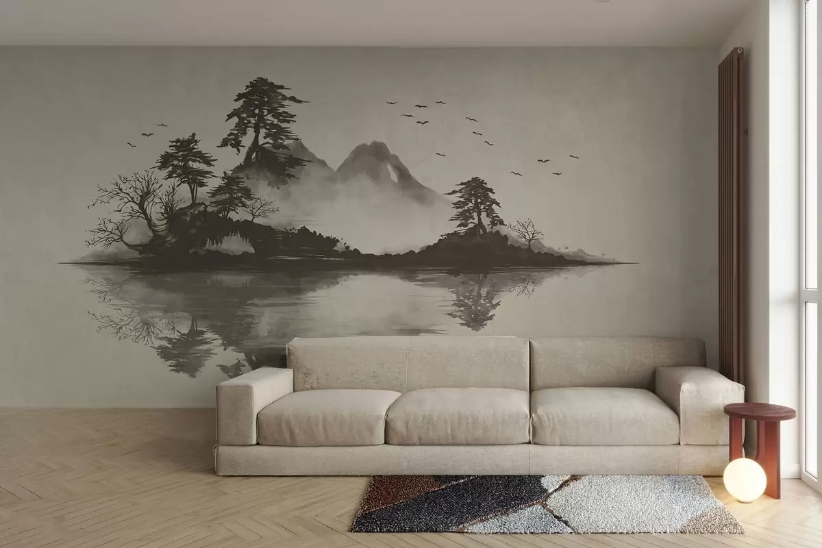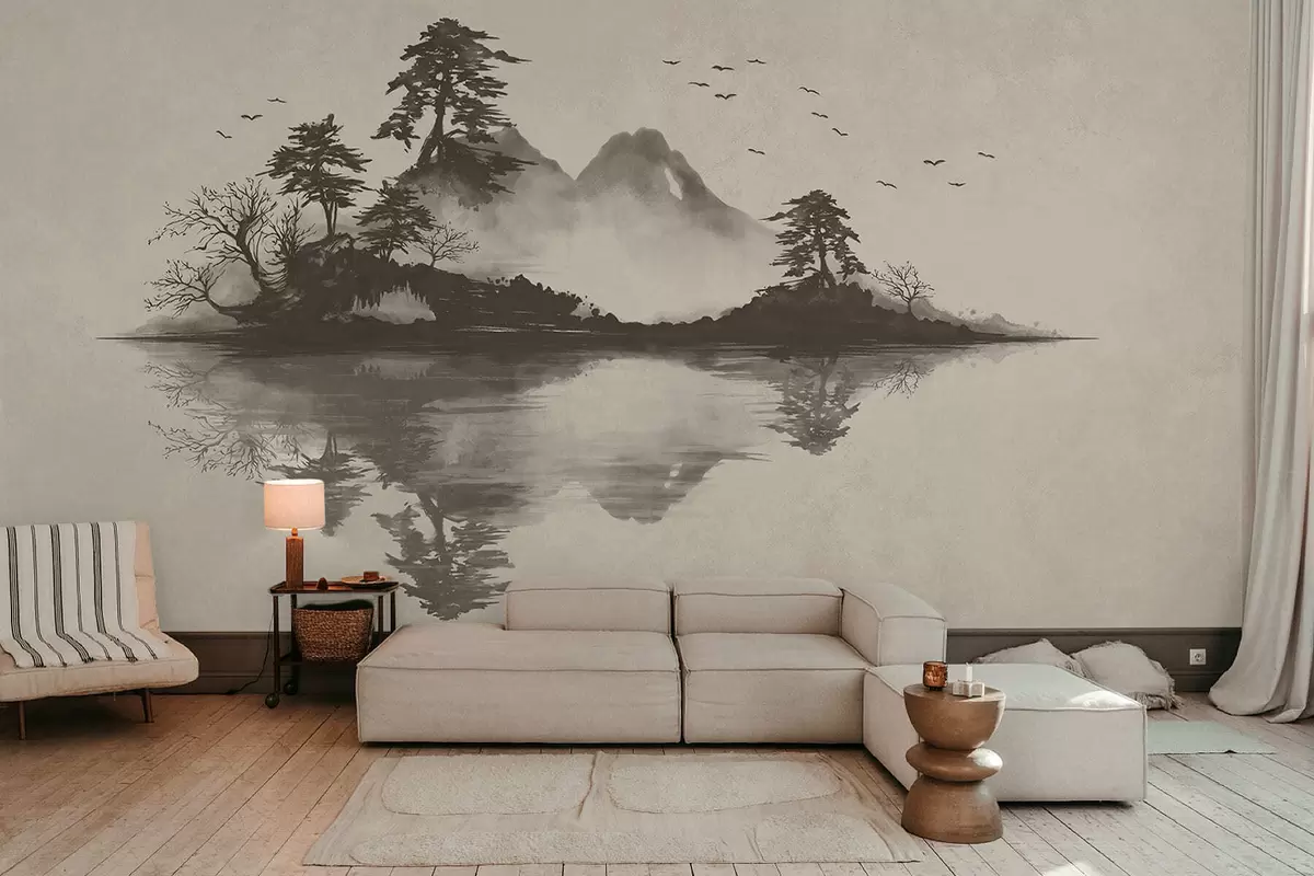 Fotomurales Paisaje montañoso en estilo sumi-e en suaves tonos grises Nr. w05124v1