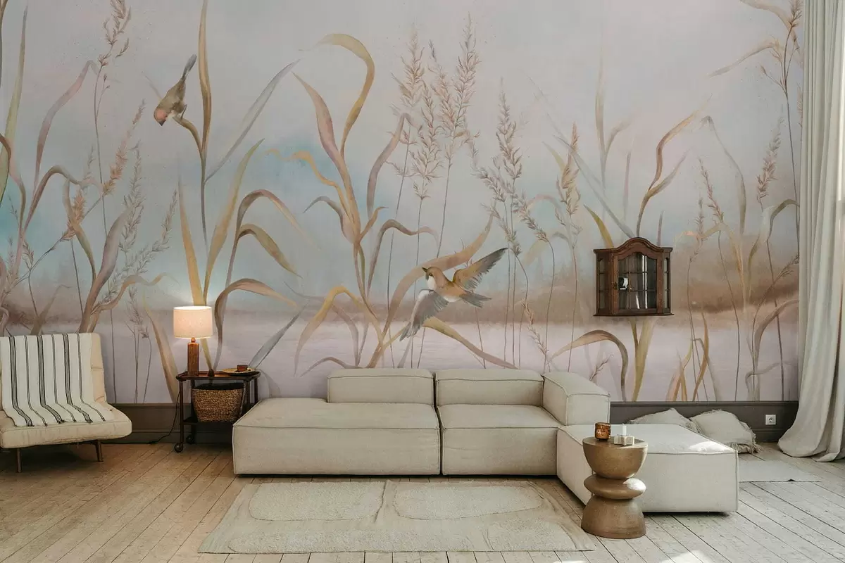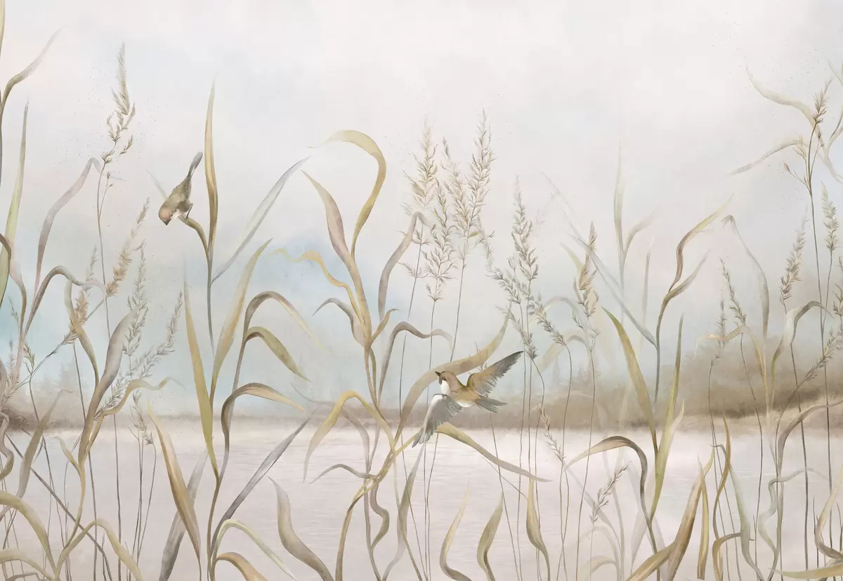 Fotomurales Ilustración de juncos y pájaros junto al agua en tonos suaves. Nr. w05125