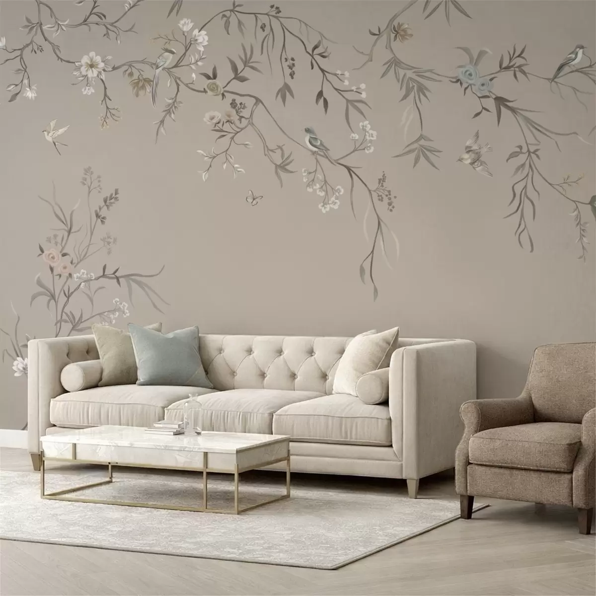 Fotomurales Adorno floral con pájaros sobre fondo neutro Nr. w05127v3