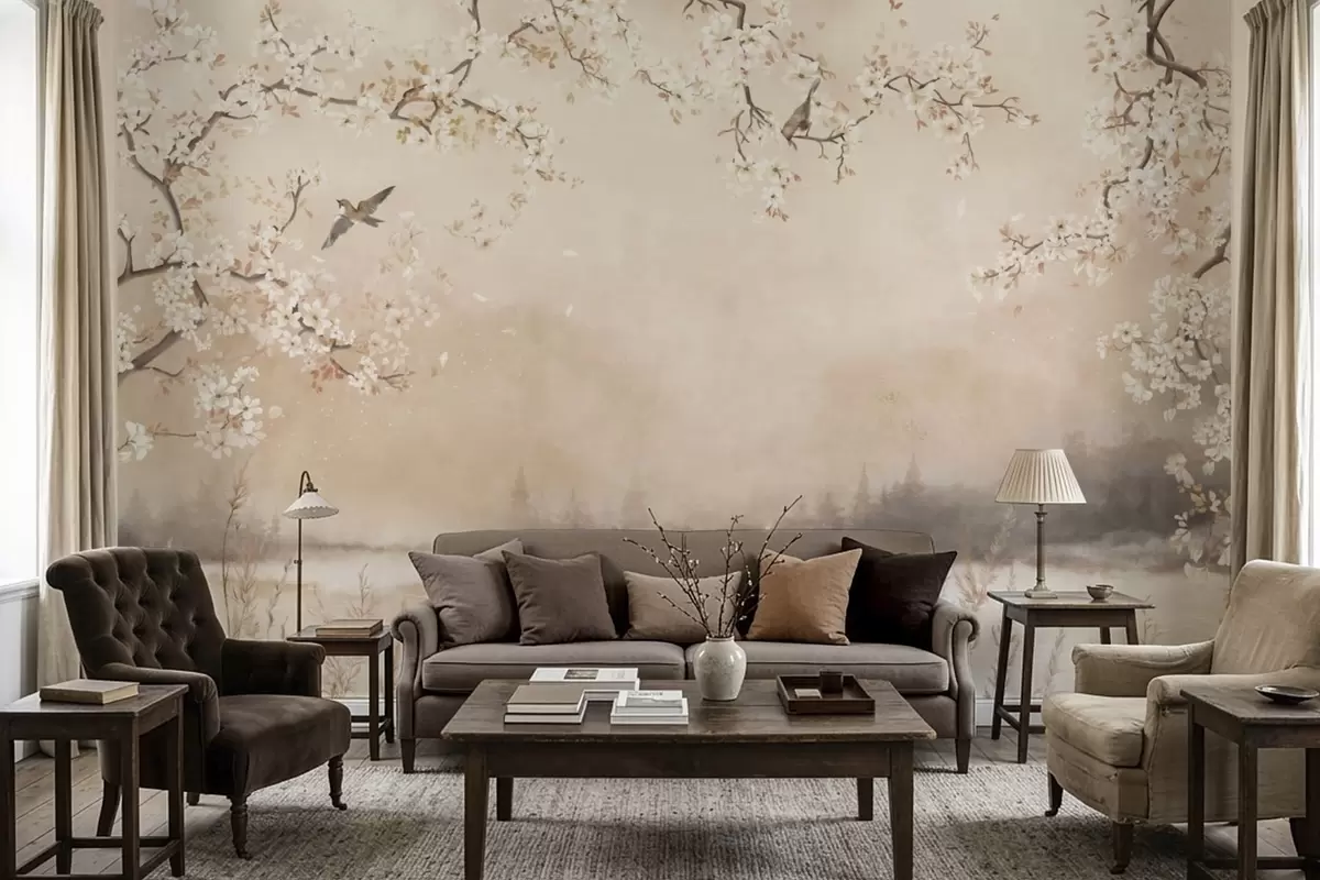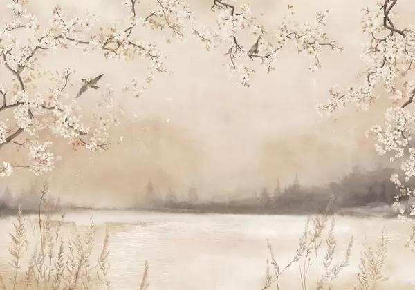 Fotomurales Delicadas ramas en flor junto al lago con pájaros en una ligera niebla. Nr. w05155