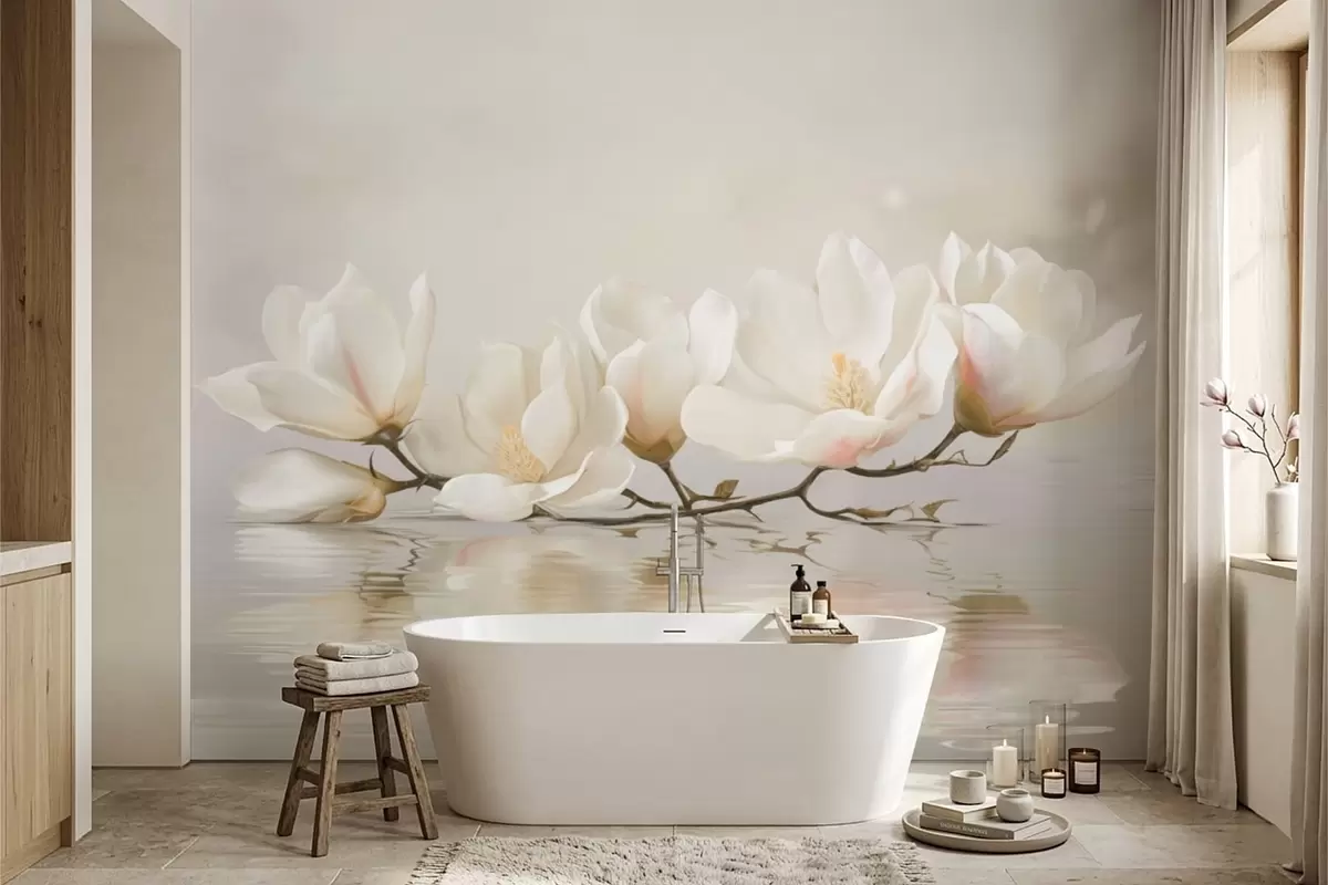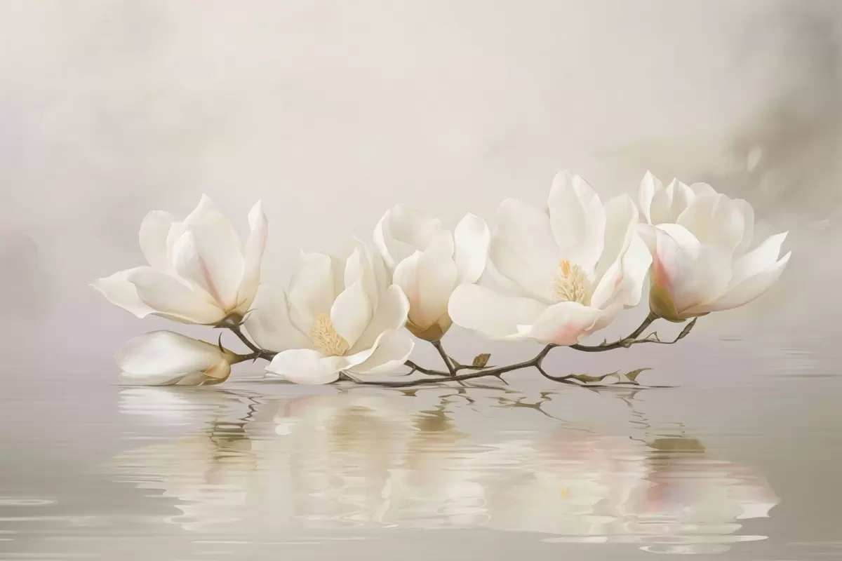 Fotomurales Ligeras flores de magnolia en una rama sobre el reflejo del agua. Nr. w05353