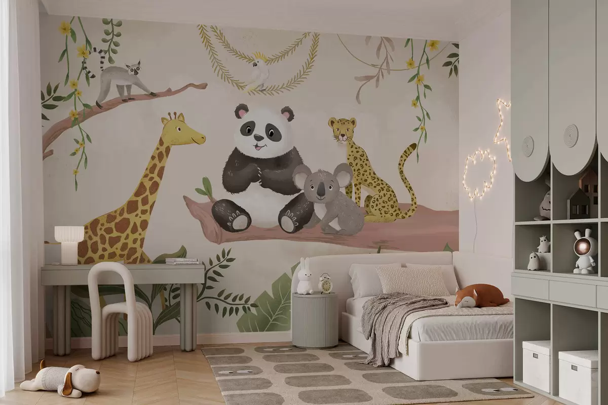 Fotomurales Simpáticos animales de la selva en una rama entre las plantas Nr. w05393
