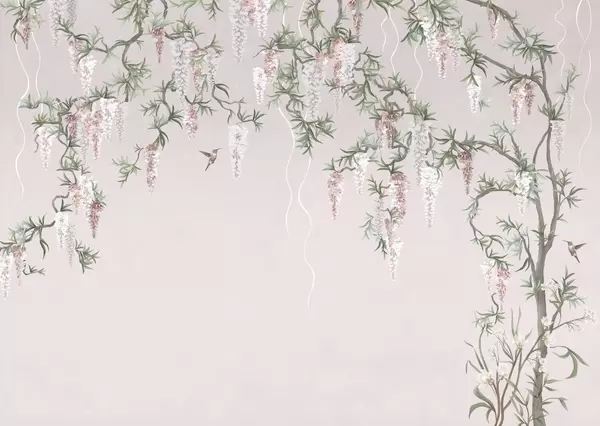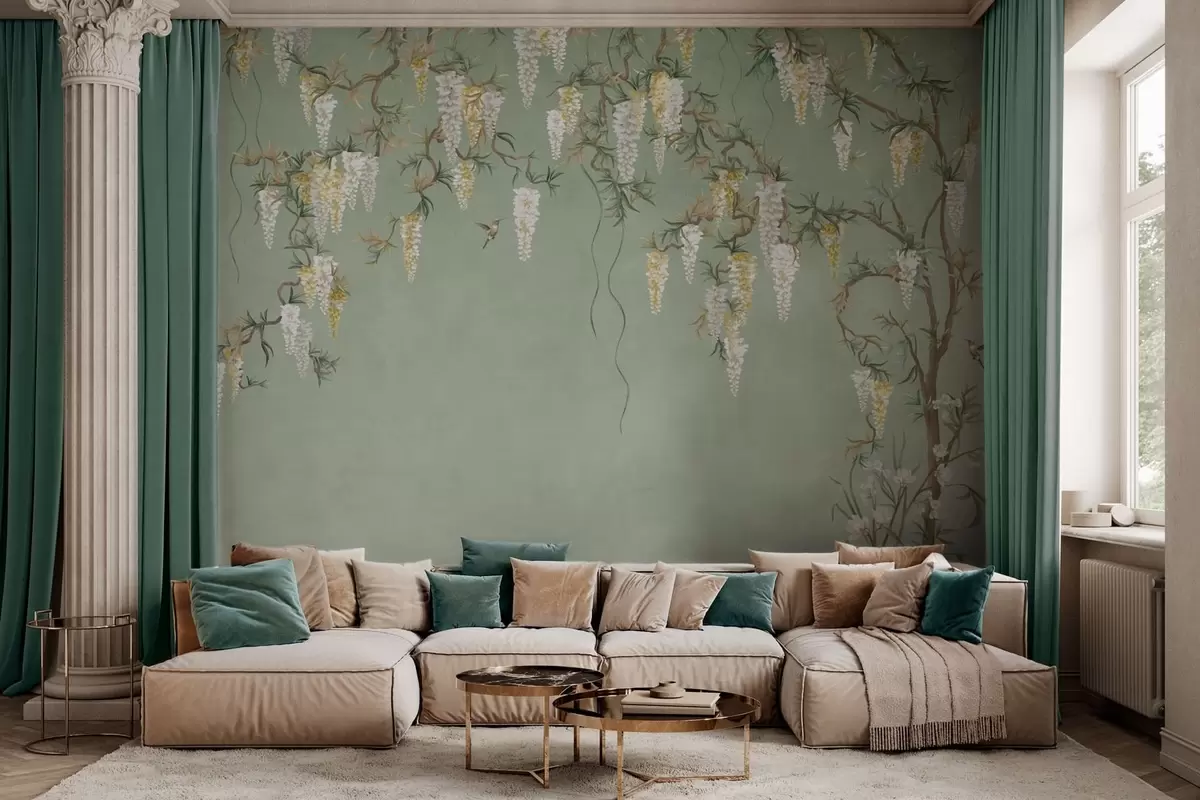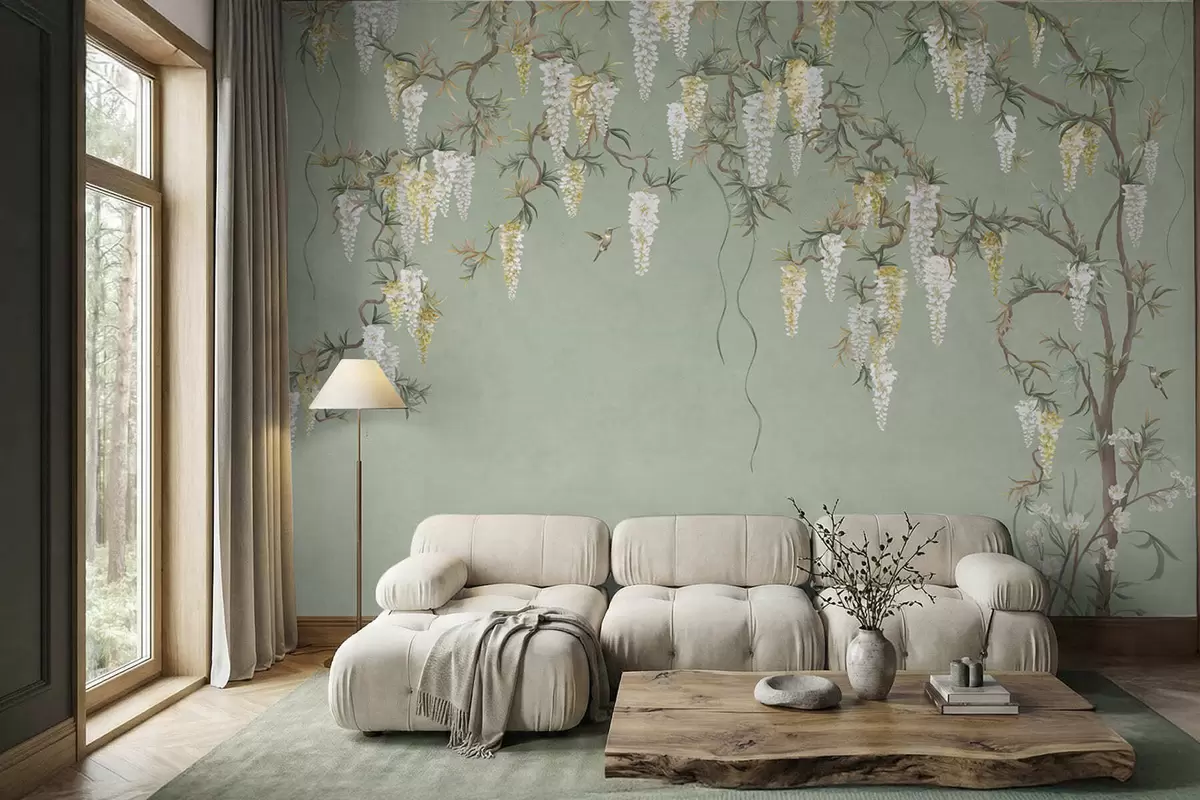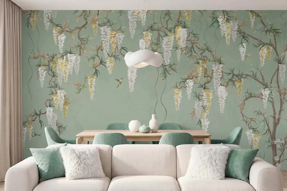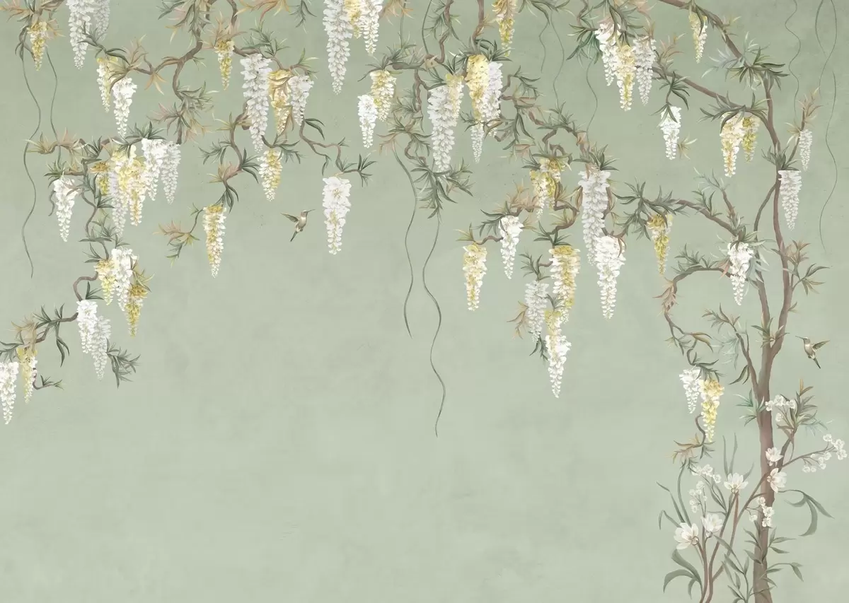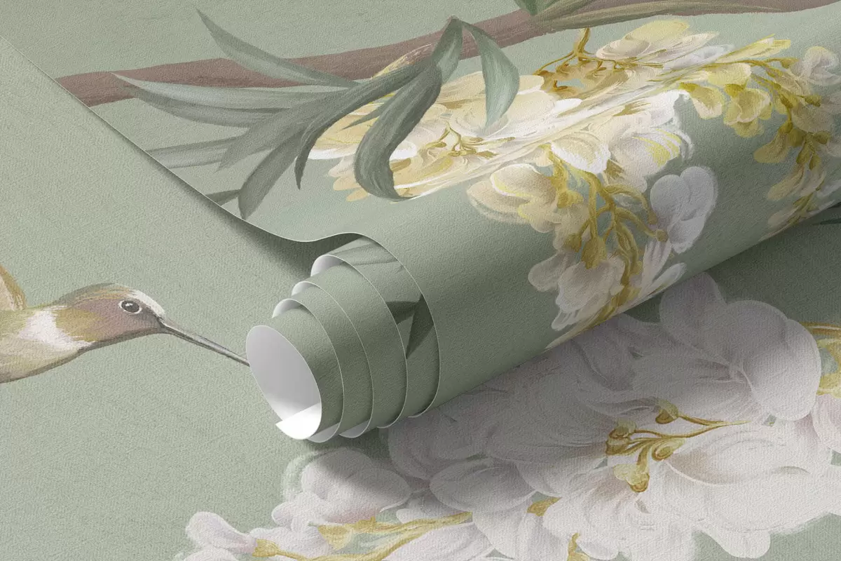 Fotomurales Ramas en flor con flores blancas y pájaros sobre un fondo verde Nr. w05394