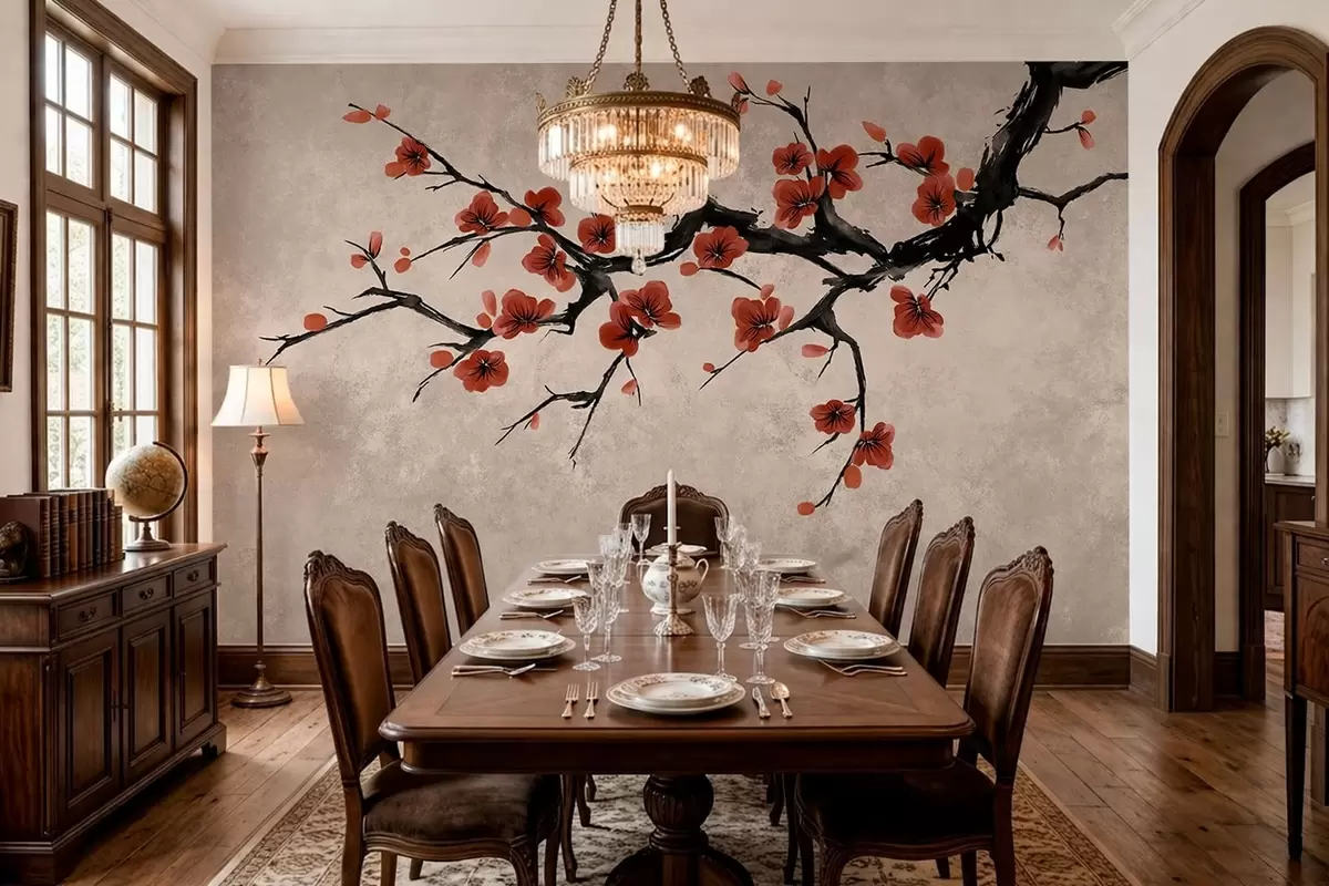 Fotomurales Rama con flores de estilo oriental sobre fondo beige Nr. w05425v4