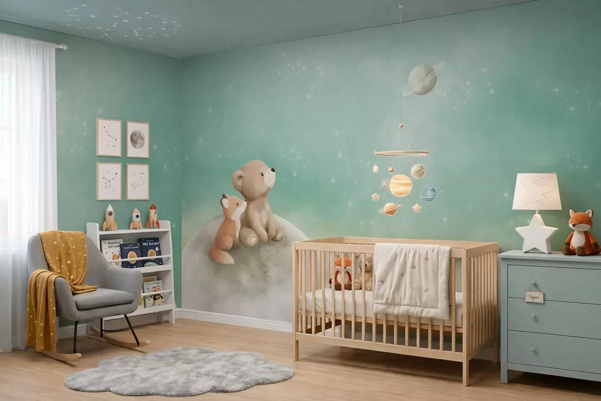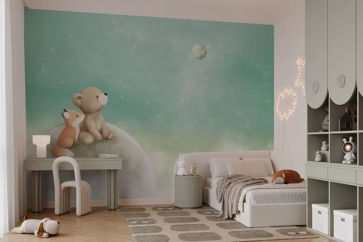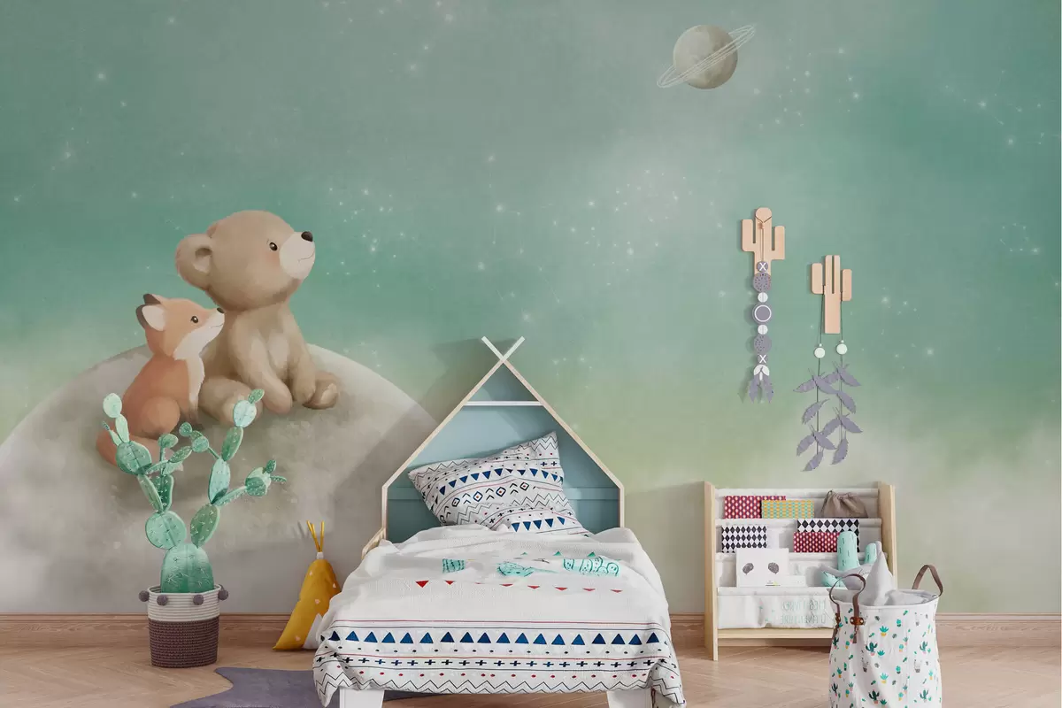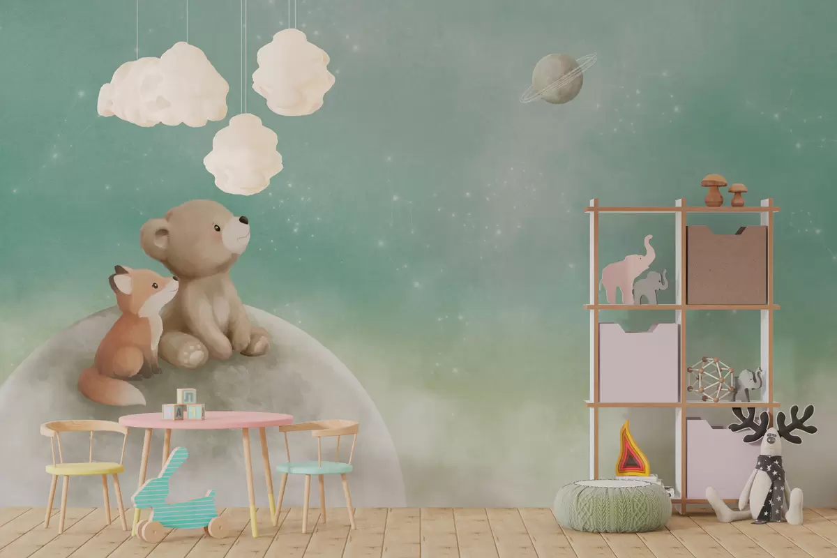 Fotomurales Ilustración al pastel de un oso y un zorro bajo un cielo verde Nr. w05431v1