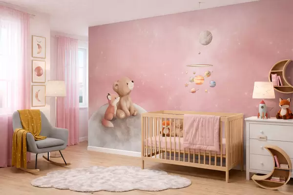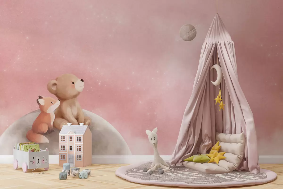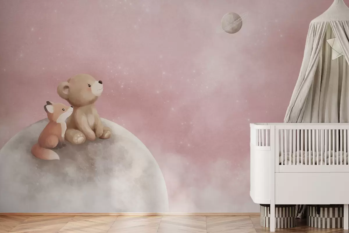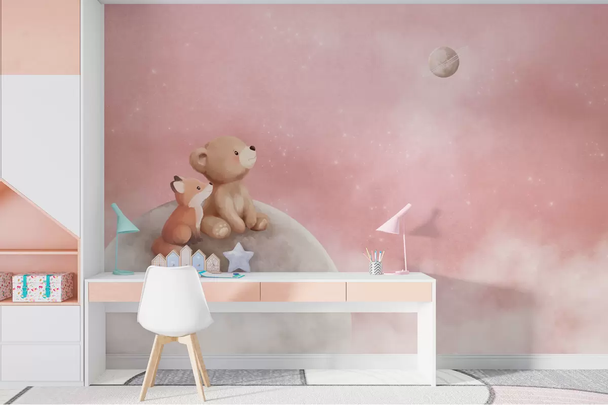 Fotomurales Ilustración al pastel de un oso y un zorro bajo un cielo rosa con la luna Nr. w05431v2