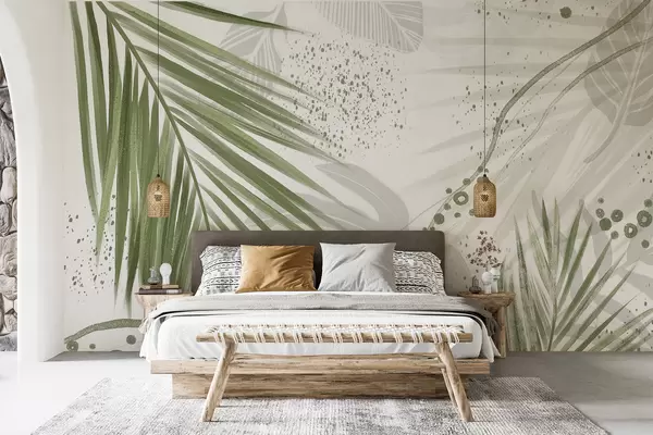 Fotomurales Hojas y frondas de palmeras verdes tropicales, con formas abstractas y salpicaduras en tonos verdes y blancos. Nr. w07918
