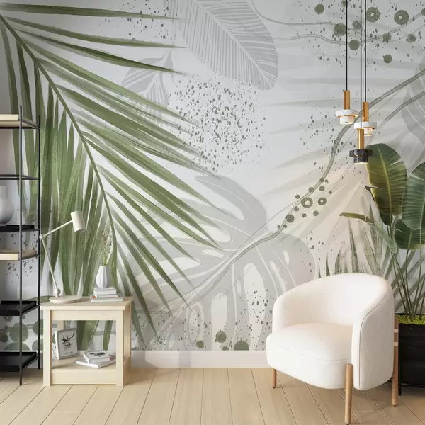Fotomurales Hojas y frondas de palmeras verdes tropicales, con formas abstractas y salpicaduras en tonos verdes y blancos Nr. w07918